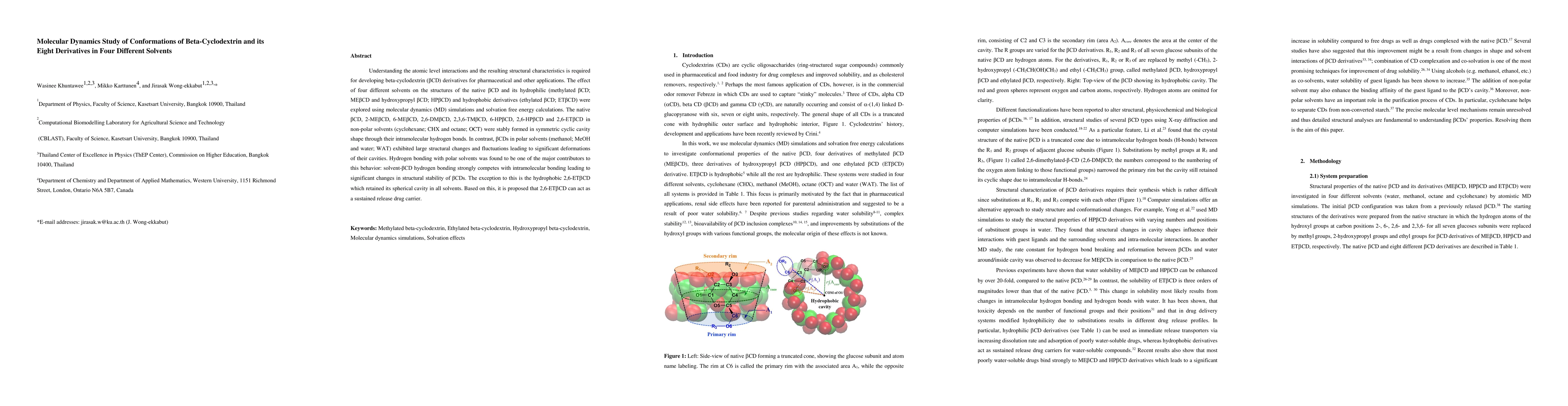 Understanding the atomic level interactions and the resulting structural characteristics is required for developing beta-cyclodextrin ($\beta$CD) derivatives for pharmaceutical and other applications. The effect of four different solvents on the structures of the native $\beta$CD and its hydrophilic (methylated $\beta$CD; ME$\beta$CD and hydroxypropyl $\beta$CD; HP$\beta$CD) and hydrophobic derivatives (ethylated $\beta$CD; ET$\beta$CD) were explored using molecular dynamics (MD) simulations and solvation free energy calculations. The native $\beta$CD, 2-ME$\beta$CD, 6-ME$\beta$CD, 2,6-DM$\beta$CD, 2,3,6-TM$\beta$CD, 6-HP$\beta$CD, 2,6-HP$\beta$CD and 2,6-ET$\beta$CD in non-polar solvents (cyclohexane; CHX and octane; OCT) were stably formed in symmetric cyclic cavity shape through their intramolecular hydrogen bonds. In contrast, $\beta$CDs in polar solvents (methanol; MeOH and water; WAT) exhibited large structural changes and fluctuations leading to significant deformations of their cavities. Hydrogen bonding with polar solvents was found to be one of the major contributors to this behavior: solvent-\b{eta}CD hydrogen bonding strongly competes with intramolecular bonding leading to significant changes in structural stability of $\beta$CDs. The exception to this is the hydrophobic 2,6-ET$\beta$CD which retained its spherical cavity in all solvents. Based on this, it is proposed that 2,6-ET$\beta$CD can act as a sustained release drug carrier.
