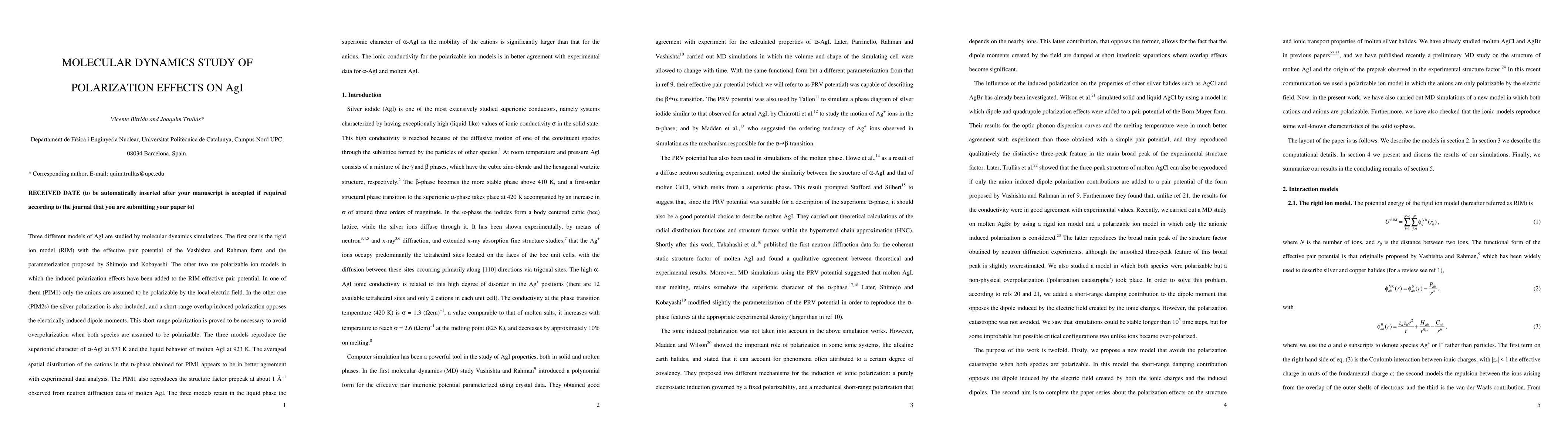 This study uses molecular dynamics simulations to compare three models of AgI: a rigid ion model and two polarizable ion models. The polarizable models show better agreement with experimental data, particularly PIM1, which aligns more closely with neutron diffraction data and ionic conductivity measurements.