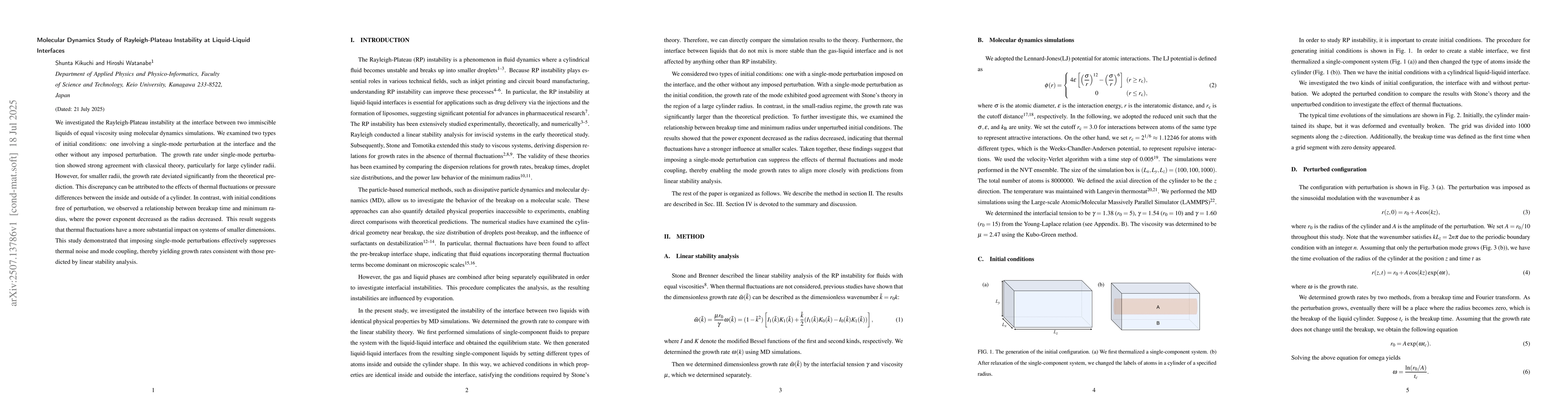 We investigated the Rayleigh-Plateau instability at the interface between two immiscible liquids of equal viscosity using molecular dynamics simulations. We examined two types of initial conditions: one involving a single-mode perturbation at the interface and the other without any imposed perturbation. The growth rate under single-mode perturbation showed strong agreement with classical theory, particularly for large cylinder radii.However, for smaller radii, the growth rate deviated significantly from the theoretical prediction. This discrepancy can be attributed to the effects of thermal fluctuations or pressure differences between the inside and outside of a cylinder. In contrast, with initial conditions free of perturbation, we observed a relationship between breakup time and minimum radius, where the power exponent decreased as the radius decreased. This result suggests that thermal fluctuations have a more substantial impact on systems of smaller dimensions. This study demonstrated that imposing single-mode perturbations effectively suppresses thermal noise and mode coupling, thereby yielding growth rates consistent with those predicted by linear stability analysis.