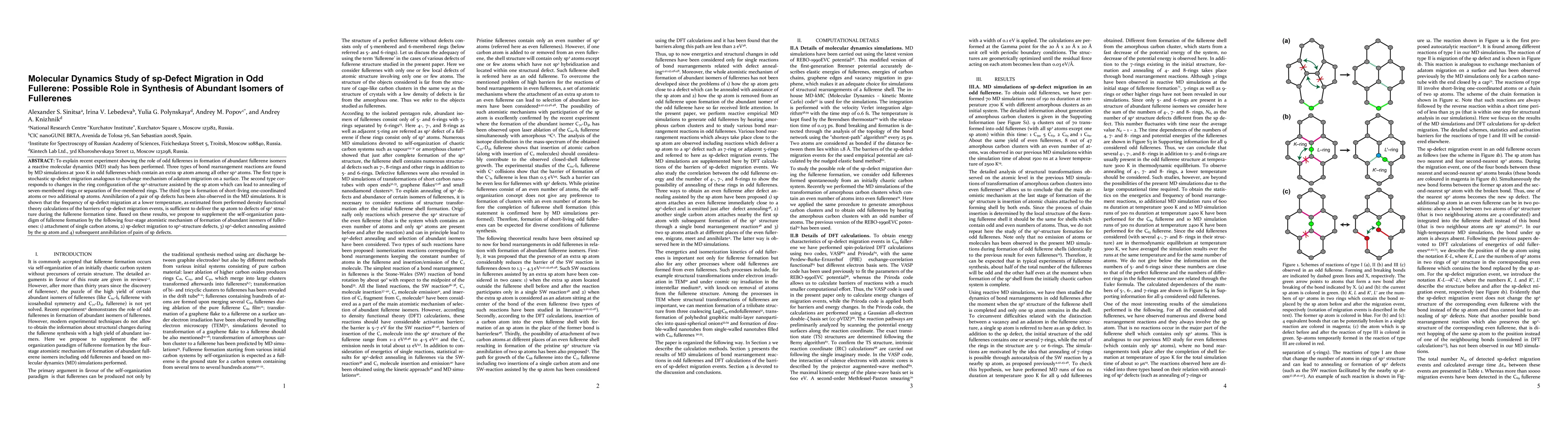 To explain recent experiment showing the role of odd fullerenes in formation of abundant fullerene isomers a reactive molecular dynamics (MD) study has been performed. Three types of bond rearrangement reactions are found by MD simulations at 3000 K in odd fullerenes which contain an extra sp atom among all other sp$^2$ atoms. The first type is sto-chastic sp-defect migration analogous to exchange mechanism of adatom migration on a surface. The second type cor-responds to changes in the ring configuration of the sp$^2$-structure assisted by the sp atom which can lead to annealing of seven-membered rings or separation of five-membered rings. The third type is formation of short-living one-coordinated atoms or two additional sp atoms. Annihilation of a pair of sp defects has been also observed in the MD simulations. It is shown that the frequency of sp-defect migration at a lower temperature, as estimated from performed density functional theory calculations of the barriers of sp-defect migration events, is sufficient to deliver the sp atom to defects of sp$^2$ structure during the fullerene formation time. Based on these results, we propose to supplement the self-organization paradigm of fullerene formation by the following four-stage atomistic mechanism of formation of abundant isomers of fullerenes: 1) attachment of single carbon atoms, 2) sp-defect migration to sp$^2$-structure defects, 3) sp$^2$-defect annealing assisted by the sp atom and 4) subsequent annihilation of pairs of sp defects.