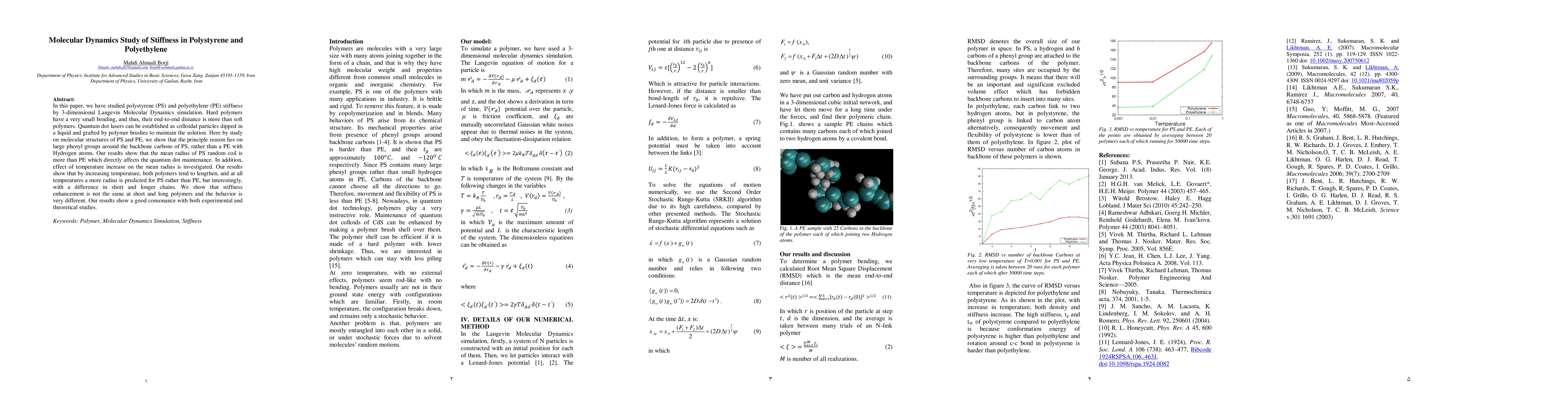 In this paper, we have studied polystyrene (PS) and polyethylene (PE) stiffness by 3-dimensional Langevin Molecular Dynamics simulation. Hard polymers have a very small bending, and thus, their end-to-end distance is more than soft polymers. Quantum dot lasers can be established as colloidal particles dipped in a liquid and grafted by polymer brushes to maintain the solution. Here by a study on molecular structures of PS and PE, we show that the principle reason lies on large phenyl groups around the backbone carbons of PS, rather than a PE with Hydrogen atoms. Our results show that the mean radius of PS random coil is more than PE which directly affects the quantum dot maintenance. In addition, effect of temperature increase on the mean radius is investigated. Our results show that by increasing temperature, both polymers tend to lengthen, and at all temperatures a more radius is predicted for PS rather than PE, but interestingly, with a difference in short and long chains. We show that stiffness enhancement is not the same at short and long polymers and the behavior is very different. Our results show a good consonance with both experimental and theoretical studies.
