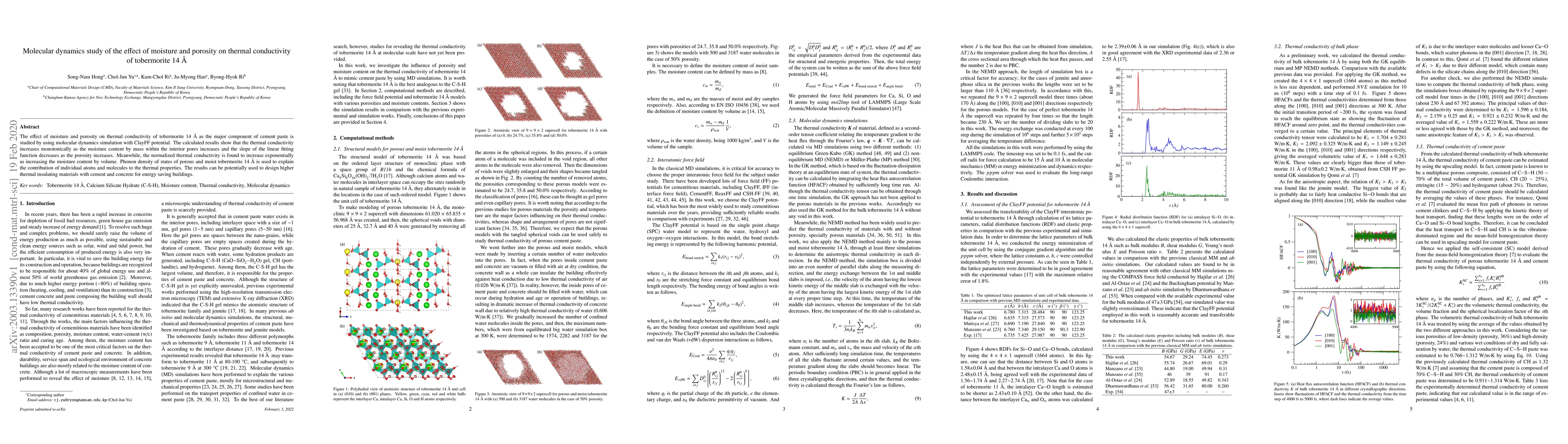 This study used molecular dynamics simulation to investigate how moisture and porosity affect thermal conductivity in tobermorite 14 °, finding that it increases with moisture content and decreases with porosity, potentially leading to the design of more efficient thermal insulating materials for energy-saving buildings.