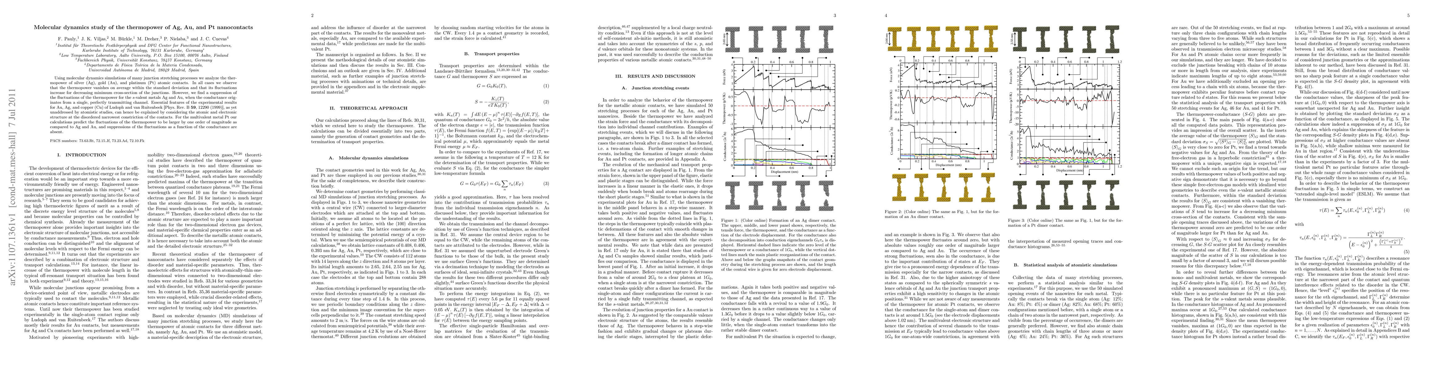 This study uses molecular dynamics simulations to analyze the thermopower of Ag, Au, and Pt nanocontacts, finding that thermopower vanishes on average but fluctuates more with smaller junction cross-sections. Notably, Ag and Au show suppressed thermopower fluctuations when conductance is from a single channel, aligning with experimental observations. In contrast, Pt exhibits significantly larger thermopower fluctuations without such suppression.