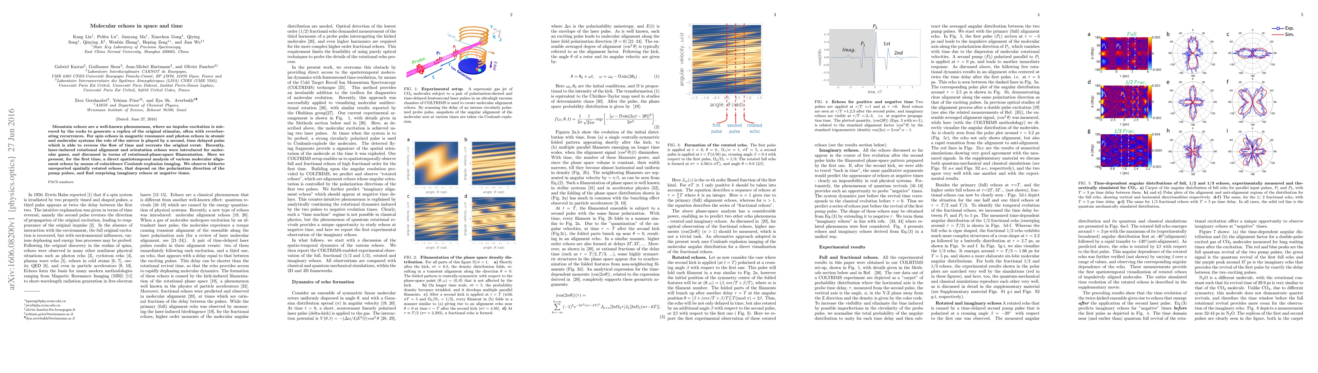 Mountain echoes are a well-known phenomenon, where an impulse excitation is mirrored by the rocks to generate a replica of the original stimulus, often with reverberating recurrences. For spin echoes in magnetic resonance and photon echoes in atomic and molecular systems the role of the mirror is played by a second, time delayed pulse which is able to reverse the ow of time and recreate the original event. Recently, laser-induced rotational alignment and orientation echoes were introduced for molecular gases, and discussed in terms of rotational-phase-space filamentation. Here we present, for the first time, a direct spatiotemporal analysis of various molecular alignment echoes by means of coincidence Coulomb explosion imaging. We observe hitherto unreported spatially rotated echoes, that depend on the polarization direction of the pump pulses, and find surprising imaginary echoes at negative times.