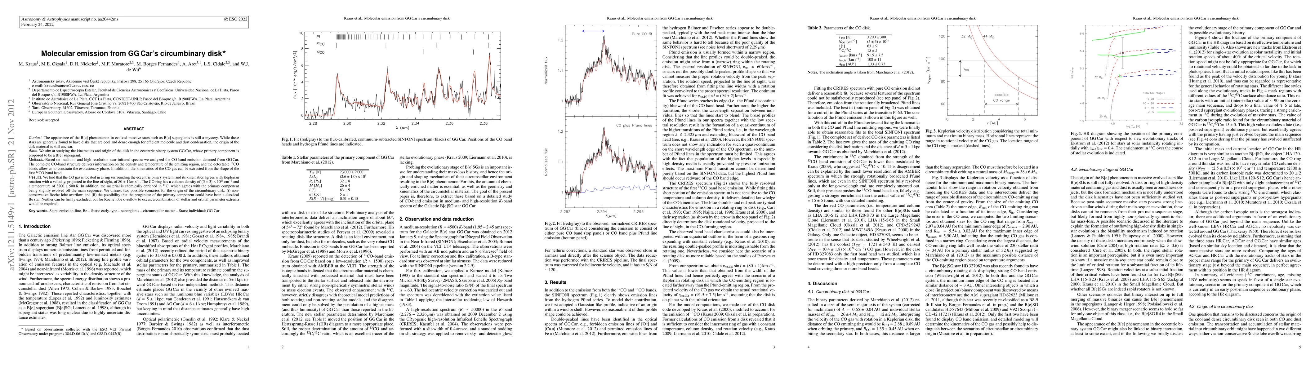 The appearance of the B[e] phenomenon in evolved massive stars such as B[e] supergiants is still a mystery. While these stars are generally found to have disks that are cool and dense enough for efficient molecule and dust condensation, the origin of the disk material is still unclear. We aim at studying the kinematics and origin of the disk in the eccentric binary system GG Car, whose primary component is proposed to be a B[e] supergiant. Based on medium- and high-resolution near-infrared spectra we analyzed the CO-band emission detected from GG Car. The complete CO-band structure delivers information on the density and temperature of the emitting region, and the detectable 13CO bands allow us to constrain the evolutionary phase. In addition, the kinematics of the CO gas can be extracted from the shape of the first 12CO band head. We find that the CO gas is located in a ring surrounding the eccentric binary system, and its kinematics agrees with Keplerian rotation with a velocity, projected to the line of sight, of (80\pm 1) km/s. The CO ring has a column density of (5\pm 3)x10^21 cm^-2 and a temperature of 3200\pm 500 K. In addition, the material is chemically enriched in 13CO, which agrees with the primary component being slightly evolved off the main sequence. We discuss two possible scenarios for the origin of the circumbinary disk: (i) non-conservative Roche lobe overflow, and (ii) the possibility that the progenitor of the primary component could have been a classical Be star. Neither can be firmly excluded, but for Roche lobe overflow to occur, a combination of stellar and orbital parameter extremawould be required.