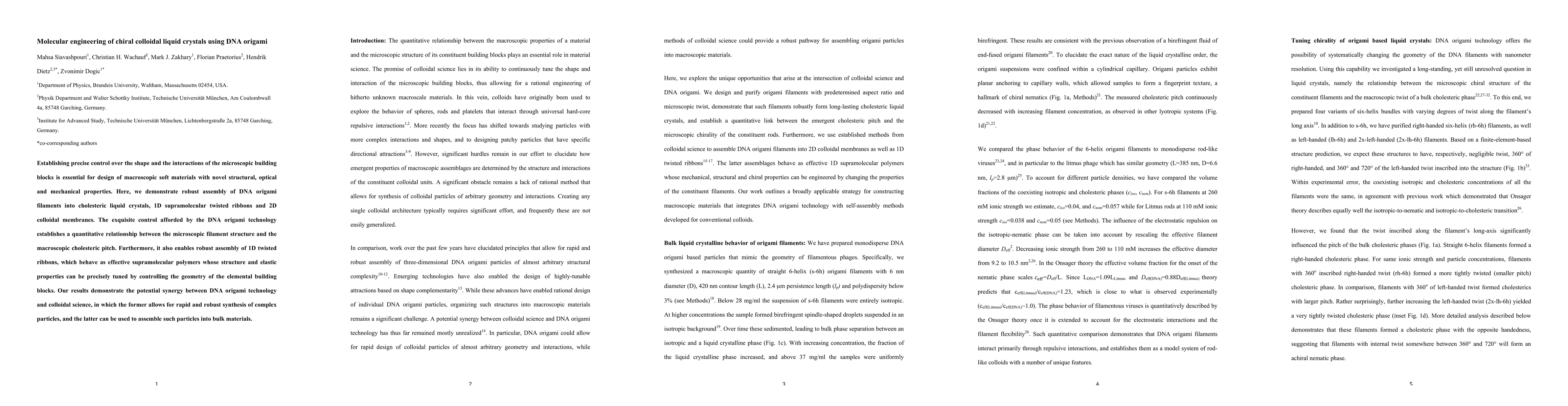 This paper demonstrates the precise assembly of DNA origami filaments into chiral colloidal liquid crystals, showcasing the potential of DNA origami technology to control the microscopic structure and interactions for creating novel macroscopic materials with tunable structural, optical, and mechanical properties. The study highlights the synergy between DNA origami and colloidal science for synthesizing complex particles and assembling them into bulk materials.