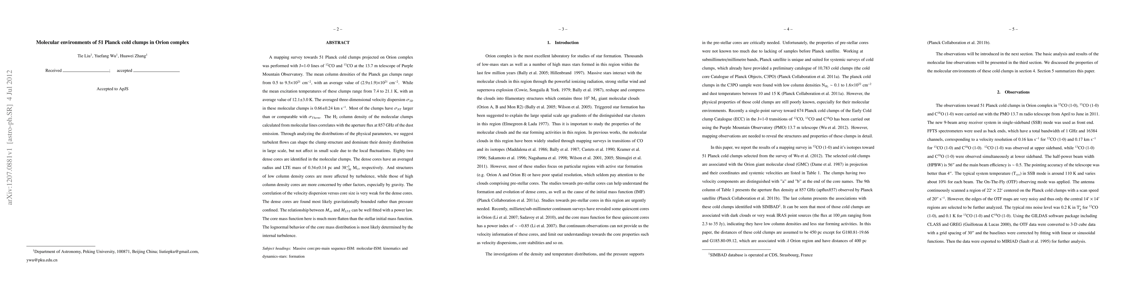 A mapping survey towards 51 Planck cold clumps projected on Orion complex was performed with J=1-0 lines of $^{12}$CO and $^{13}$CO at the 13.7 m telescope of Purple Mountain Observatory. The mean column densities of the Planck gas clumps range from 0.5 to 9.5$\times10^{21}$ cm$^{-2}$, with an average value of (2.9$\pm$1.9)$\times10^{21}$ cm$^{-2}$. While the mean excitation temperatures of these clumps range from 7.4 to 21.1 K, with an average value of 12.1$\pm$3.0 K. The averaged three-dimensional velocity dispersion $\sigma_{3D}$ in these molecular clumps is 0.66$\pm$0.24 km s$^{-1}$. Most of the clumps have $\sigma_{NT}$ larger than or comparable with $\sigma_{Therm}$. The H$_{2}$ column density of the molecular clumps calculated from molecular lines correlates with the aperture flux at 857 GHz of the dust emission. Through analyzing the distributions of the physical parameters, we suggest turbulent flows can shape the clump structure and dominate their density distribution in large scale, but not affect in small scale due to the local fluctuations. Eighty two dense cores are identified in the molecular clumps. The dense cores have an averaged radius and LTE mass of 0.34$\pm$0.14 pc and 38$_{-30}^{+5}$ M$_{\sun}$, respectively. And structures of low column density cores are more affected by turbulence, while those of high column density cores are more concerned by other factors, especially by gravity. The correlation of the velocity dispersion versus core size is very weak for the dense cores. The dense cores are found most likely gravitationally bounded rather than pressure confined. The relationship between $M_{vir}$ and $M_{LTE}$ can be well fitted with a power law. The core mass function here is much more flatten than the stellar initial mass function. The lognormal behavior of the core mass distribution is most likely determined by the internal turbulence.