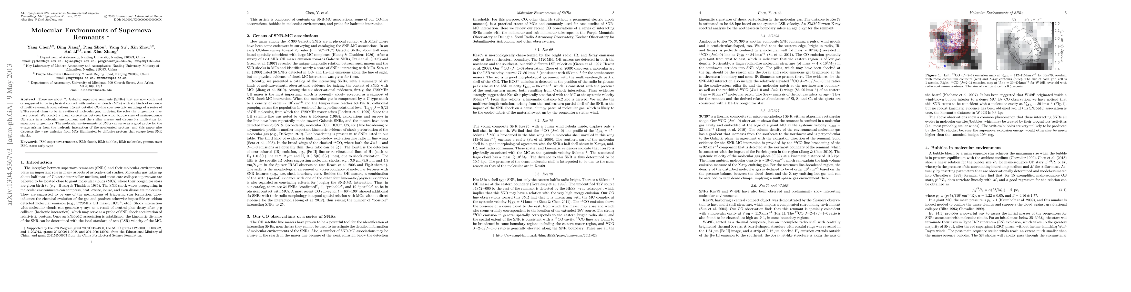 There are about 70 Galactic supernova remnants (SNRs) that are now confirmed or suggested to be in physical contact with molecular clouds (MCs) with six kinds of evidence of multiwavelength observations. Recent detailed CO-line spectroscopic mappings of a series of SNRs reveal them to be in cavities of molecular gas, implying the roles the progenitors may have played. We predict a linear correlation between the wind bubble sizes of main-sequence OB stars in a molecular environment and the stellar masses and discuss its implication for supernova progenitors. The molecular environments of SNRs can serve as a good probe for the gamma-rays arising from the hadronic interaction of the accelerated protons, and this paper also discusses the gamma-ray emission from MCs illuminated by diffusive protons that escape from SNR shocks.