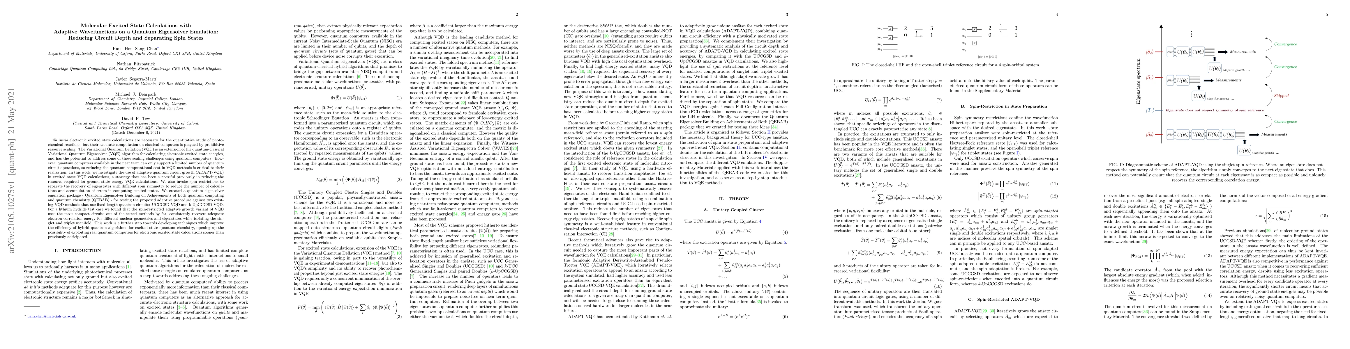 This paper explores adaptive quantum circuit growth (ADAPT-VQE) to reduce the computational cost of Variational Quantum Deflation (VQD) for excited state calculations, using a quantum eigensolver emulation package called QEBAB. The adaptive method, combined with spin restrictions, significantly reduces circuit depth and effectively separates spin states, demonstrating potential for efficient quantum computation of electronic excited states on near-term quantum devices.