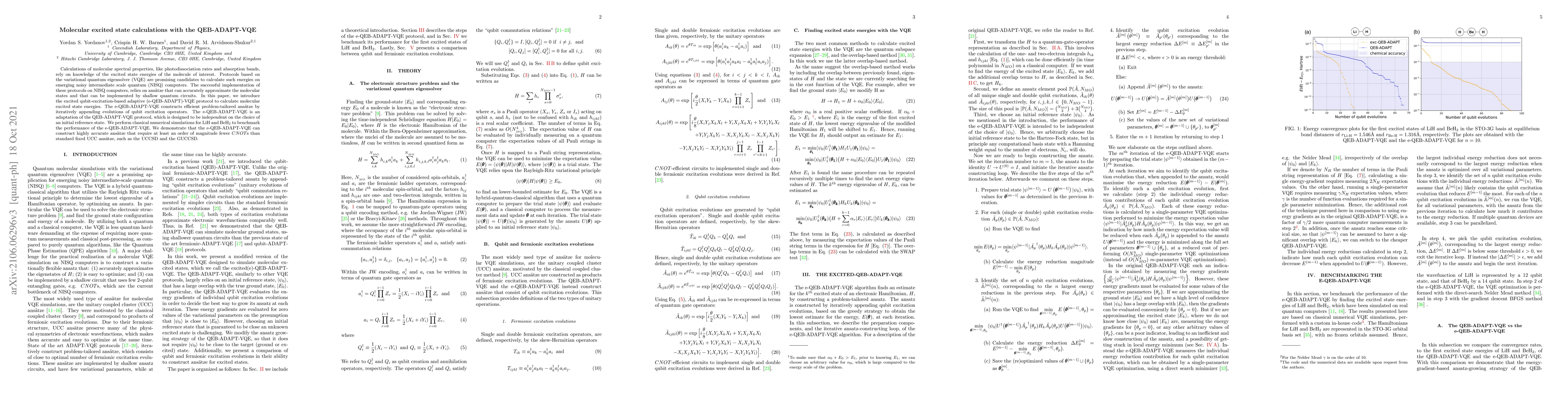 This paper introduces the e-QEB-ADAPT-VQE protocol for calculating molecular excited state energies on NISQ computers. The protocol constructs efficient ansätze by iteratively adding qubit excitation evolutions, requiring significantly fewer CNOT gates compared to standard methods like UCCSD, demonstrating improved performance through simulations on LiH and BeH$_2$.