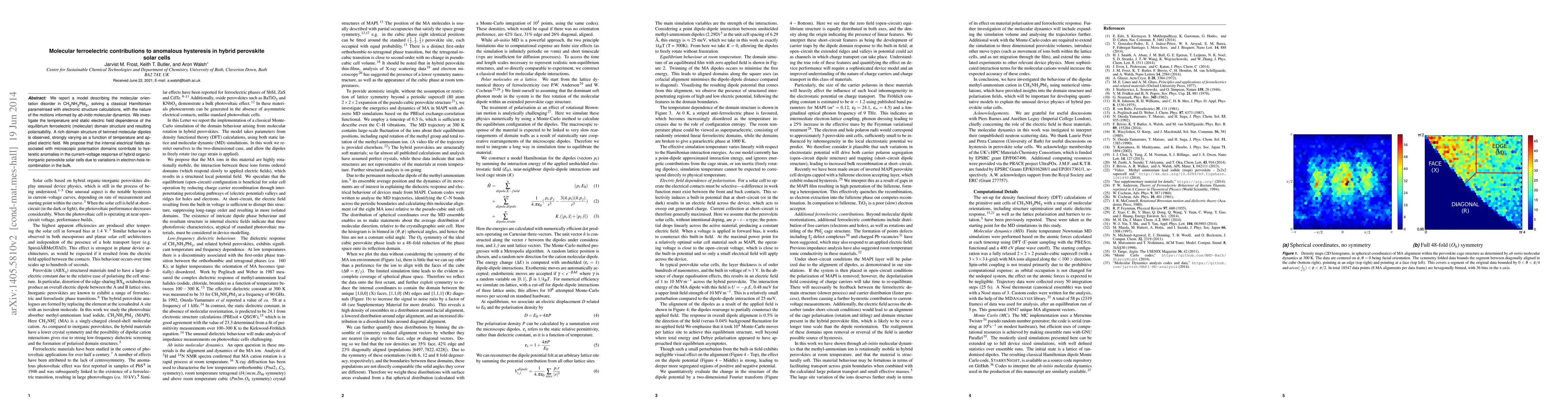 This paper models molecular orientation disorder in CH3NH3PbI3 perovskite, revealing a complex ferroelectric domain structure influenced by temperature and electric fields. The study suggests that internal electrical fields from these domains cause anomalous hysteresis in the current-voltage response of perovskite solar cells, attributed to changes in electron-hole recombination.