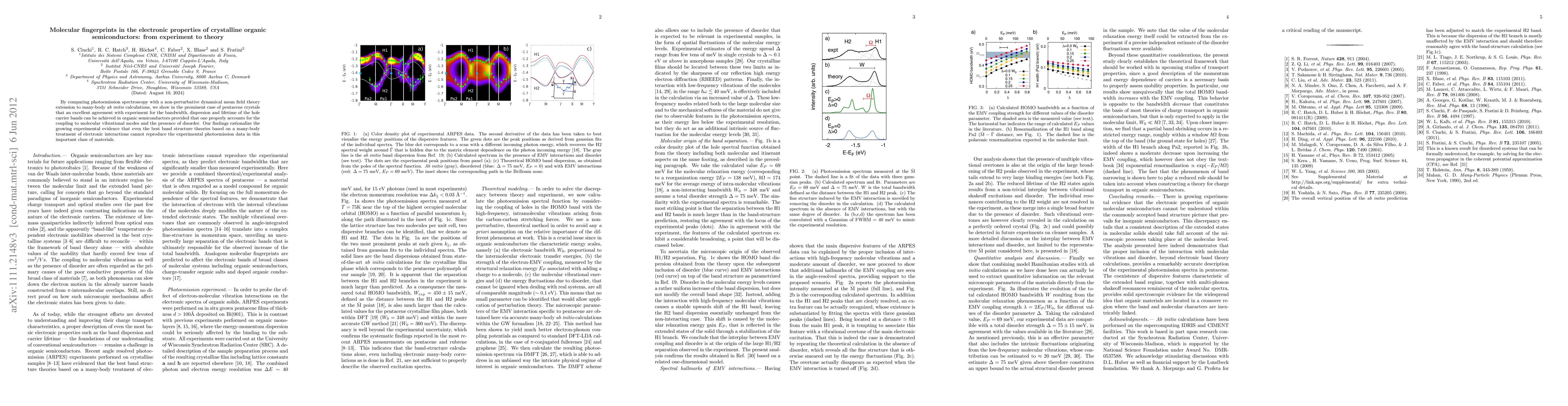 This paper demonstrates that combining photoemission spectroscopy with a non-perturbative dynamical mean field theory can accurately model the electronic properties of pentacene crystals, highlighting the importance of accounting for molecular vibrations and disorder to match experimental data. It underscores the limitations of traditional band structure theories in organic semiconductors.