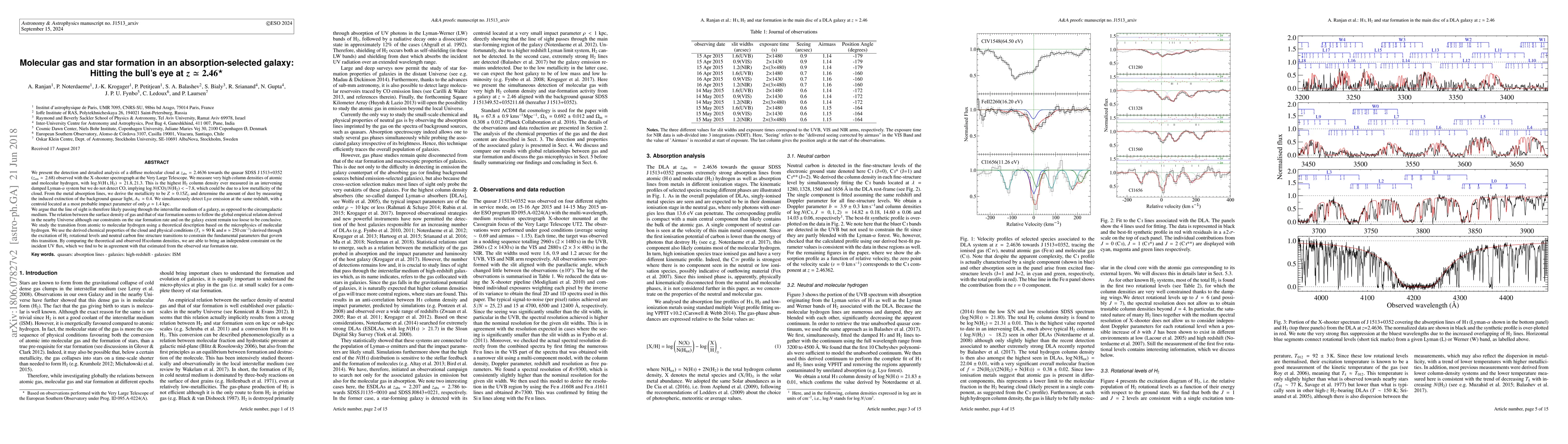 We present the detection analysis of a diffuse molecular cloud at z$_{abs}$=2.4636 towards the quasar SDSS J1513+0352(z$_{em}\,\simeq$ 2.68) observed with the X-shooter spectrograph(VLT). We measure very high column densities of atomic and molecular hydrogen, with log N(HI,H$_2$)$\simeq$21.8,21.3. This is the highest H$_2$ column density ever measured in an intervening damped Lyman-alpha system but we do not detect CO, implying log N(CO)/N(H$_2$) < -7.8, which could be due to a low metallicity of the cloud. From the metal absorption lines, we derive the metallicity to be Z $\simeq$ 0.15 Z$_{\odot}$ and determine the amount of dust by measuring the induced extinction of the background quasar light, A$_V$ $\simeq$ 0.4. We also detect Ly-$\alpha$ emission at the same redshift, with a centroid located at a most probable impact parameter of only $\rho\,\simeq$ 1.4 kpc. We argue that the line of sight is therefore likely passing through the ISM of a galaxy as opposed to the CGM. The relation between the surface density of gas and that of star formation seems to follow the global empirical relation derived in the nearby Universe although our constraints on the star formation rate and on the galaxy extent remain too loose to be conclusive. We study the transition from atomic to molecular hydrogen using a theoretical description based on the microphysics of molecular hydrogen. We use the derived chemical properties of the cloud and physical conditions (T$_k\,\simeq$90 K and n$\simeq$250 cm$^{-3}$ derived through the excitation of H$_2$ rotational levels and neutral carbon fine structure transitions to constrain the fundamental parameters that govern this transition. By comparing the theoretical and observed HI column densities, we are able to bring an independent constraint on the incident UV flux, which we find to be in agreement with that estimated from the observed star formation rate.