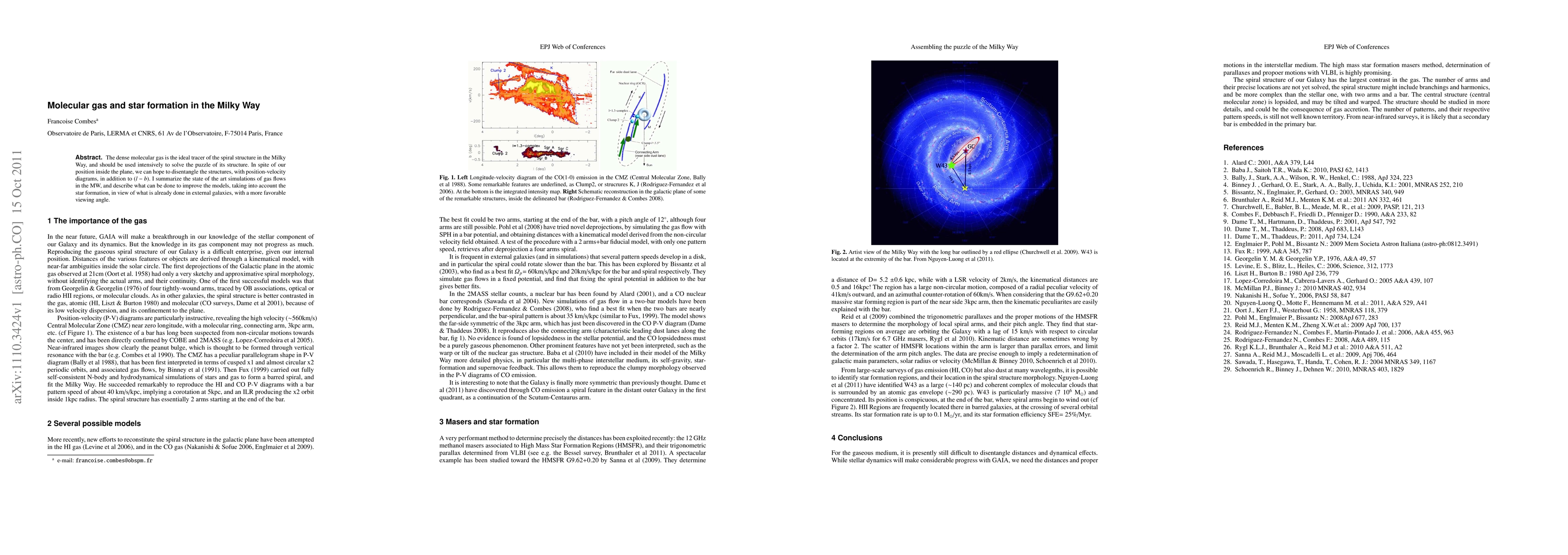 The dense molecular gas is the ideal tracer of the spiral structure in the Milky Way, and should be used intensively to solve the puzzle of its structure. In spite of our position inside the plane, we can hope to disentangle the structures, with position-velocity diagrams, in addition to $(l-b)$. I summarize the state of the art simulations of gas flows in the MW, and describe what can be done to improve the models, taking into account the star formation, in view of what is already done in external galaxies, with a more favorable viewing angle.