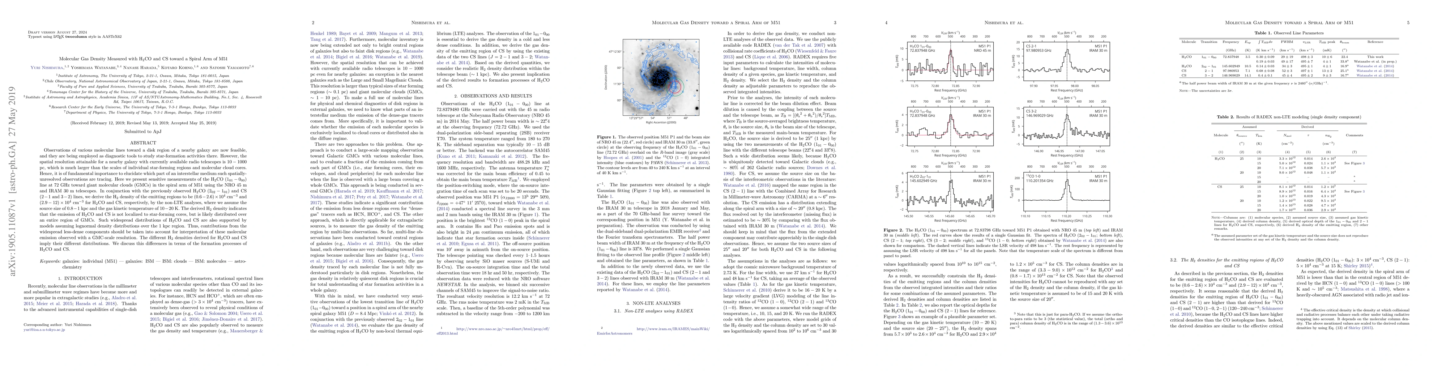 This study measures molecular gas densities in the spiral arm of M51 using H$_2$CO and CS lines, finding H$_2$ densities of $(0.6-2.6)\times10^4$ cm$^{-3}$ and $(2.9-12)\times10^4$ cm$^{-3}$ respectively, indicating that these emissions are widespread across GMCs rather than localized to star-forming cores.