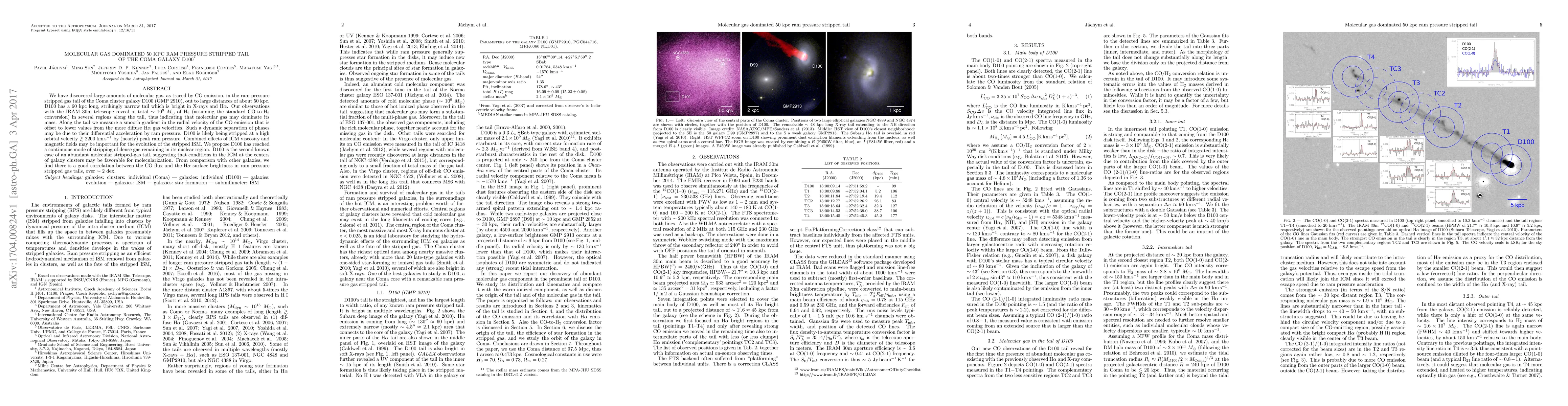 We have discovered large amounts of molecular gas, as traced by CO emission, in the ram pressure stripped gas tail of the Coma cluster galaxy D100 (GMP 2910), out to large distances of about 50 kpc. D100 has a 60 kpc long, strikingly narrow tail which is bright in X-rays and H{\alpha}. Our observations with the IRAM 30m telescope reveal in total ~ 10^9 M_sun of H_2 (assuming the standard CO-to-H_2 conversion) in several regions along the tail, thus indicating that molecular gas may dominate its mass. Along the tail we measure a smooth gradient in the radial velocity of the CO emission that is offset to lower values from the more diffuse H{\alpha} gas velocities. Such a dynamic separation of phases may be due to their differential acceleration by ram pressure. D100 is likely being stripped at a high orbital velocity >2200 km/s by (nearly) peak ram pressure. Combined effects of ICM viscosity and magnetic fields may be important for the evolution of the stripped ISM. We propose D100 has reached a continuous mode of stripping of dense gas remaining in its nuclear region. D100 is the second known case of an abundant molecular stripped-gas tail, suggesting that conditions in the ICM at the centers of galaxy clusters may be favorable for molecularization. From comparison with other galaxies, we find there is a good correlation between the CO flux and the H{\alpha} surface brightness in ram pressure stripped gas tails, over about 2 dex.