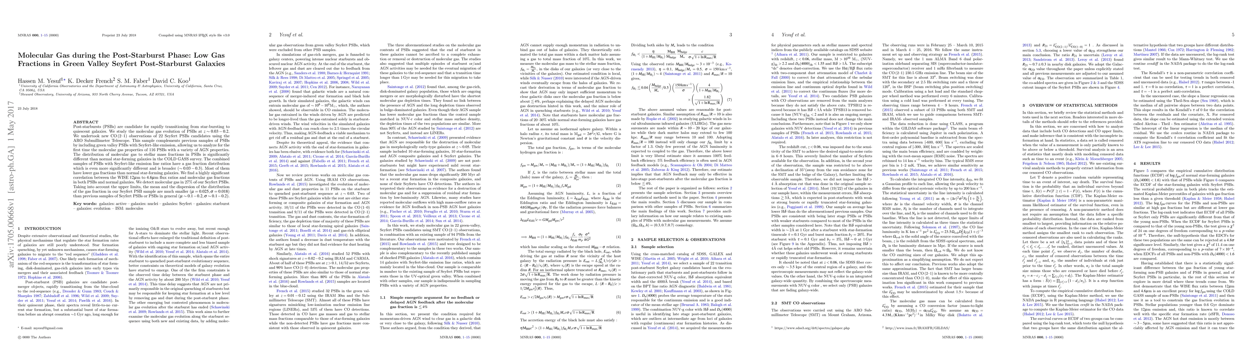 Post-starbursts (PSBs) are candidate for rapidly transitioning from star-bursting to quiescent galaxies. We study the molecular gas evolution of PSBs at z ~ 0.03 - 0.2. We undertook new CO (2-1) observations of 22 Seyfert PSBs candidates using the ARO Submillimeter Telescope. This sample complements previous samples of PSBs by including green valley PSBs with Seyfert-like emission, allowing us to analyze for the first time the molecular gas properties of 116 PSBs with a variety of AGN properties. The distribution of molecular gas to stellar mass fractions in PSBs is significantly different than normal star-forming galaxies in the COLD GASS survey. The combined samples of PSBs with Seyfert-like emission line ratios have a gas fraction distribution which is even more significantly different and is broader (~ 0.03-0.3). Most of them have lower gas fractions than normal star-forming galaxies. We find a highly significant correlation between the WISE 12 micron to 4.6 micron flux ratios and molecular gas fractions in both PSBs and normal galaxies. We detect molecular gas in 27% of our Seyfert PSBs. Taking into account the upper limits, the mean and the dispersion of the distribution of the gas fraction in our Seyfert PSB sample are much smaller (mean = 0.025, std dev. = 0.018) than previous samples of Seyfert PSBs or PSBs in general (mean ~ 0.1 - 0.2, std dev. ~ 0.1 - 0.2).