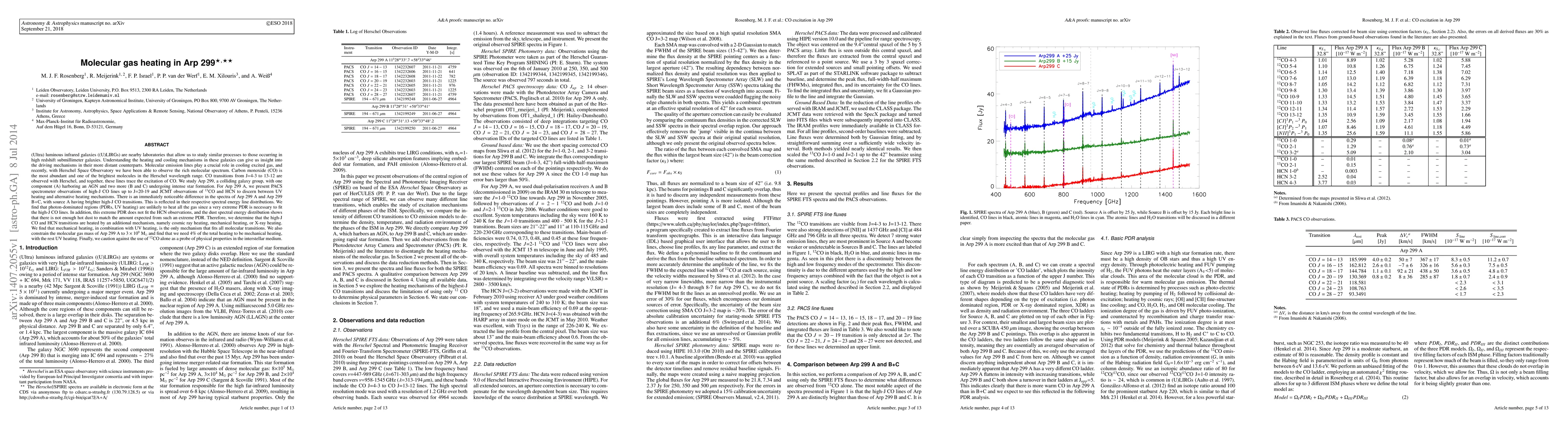 Understanding the heating and cooling mechanisms in nearby (Ultra) luminous infrared galaxies can give us insight into the driving mechanisms in their more distant counterparts. Molecular emission lines play a crucial role in cooling excited gas, and recently, with Herschel Space Observatory we have been able to observe the rich molecular spectrum. CO is the most abundant and one of the brightest molecules in the Herschel wavelength range. CO transitions are observed with Herschel, and together, these lines trace the excitation of CO. We study Arp 299, a colliding galaxy group, with one component harboring an AGN and two more undergoing intense star formation. For Arp 299 A, we present PACS spectrometer observations of high-J CO lines up to J=20-19 and JCMT observations of $^{13}$CO and HCN to discern between UV heating and alternative heating mechanisms. There is an immediately noticeable difference in the spectra of Arp 299 A and Arp 299 B+C, with source A having brighter high-J CO transitions. This is reflected in their respective spectral energy line distributions. We find that photon-dominated regions (PDRs) are unlikely to heat all the gas since a very extreme PDR is necessary to fit the high-J CO lines. In addition, this extreme PDR does not fit the HCN observations, and the dust spectral energy distribution shows that there is not enough hot dust to match the amount expected from such an extreme PDR. Therefore, we determine that the high-J CO and HCN transitions are heated by an additional mechanism, namely cosmic ray heating, mechanical heating, or X-ray heating. We find that mechanical heating, in combination with UV heating, is the only mechanism that fits all molecular transitions. We also constrain the molecular gas mass of Arp 299 A to 3e9 Msun and find that we need 4% of the total heating to be mechanical heating, with the rest UV heating.