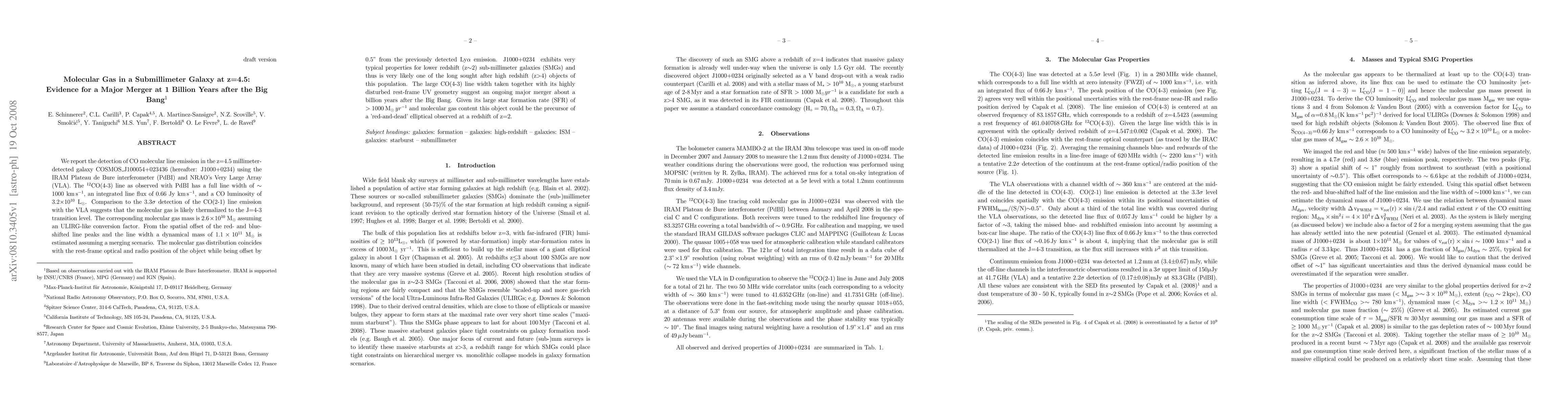 We report the detection of CO molecular line emission in the z=4.5 millimeter-detected galaxy COSMOS_J100054+023436 (hereafter: J100+0234) using the IRAM Plateau de Bure interferometer (PdBI) and NRAO's Very Large Array (VLA). The CO(4-3) line as observed with PdBI has a full line width of ~1000 km/s, an integrated line flux of 0.66 Jy km/s, and a CO luminosity of 3.2e10 L_sun. Comparison to the 3.3sigma detection of the CO(2-1) line emission with the VLA suggests that the molecular gas is likely thermalized to the J=4-3 transition level. The corresponding molecular gas mass is 2.6e10 M_sun assuming an ULIRG-like conversion factor. From the spatial offset of the red- and blue-shifted line peaks and the line width a dynamical mass of 1.1e11 M_sun is estimated assuming a merging scenario. The molecular gas distribution coincides with the rest-frame optical and radio position of the object while being offset by 0.5'' from the previously detected Ly$\alpha$ emission. J1000+0234 exhibits very typical properties for lower redshift (z~2) sub-millimeter galaxies (SMGs) and thus is very likely one of the long sought after high redshift (z>4) objects of this population. The large CO(4-3) line width taken together with its highly disturbed rest-frame UV geometry suggest an ongoing major merger about a billion years after the Big Bang. Given its large star formation rate (SFR) of >1000 M_sun/yr and molecular gas content this object could be the precursor of a 'red-and-dead' elliptical observed at a redshift of z=2.