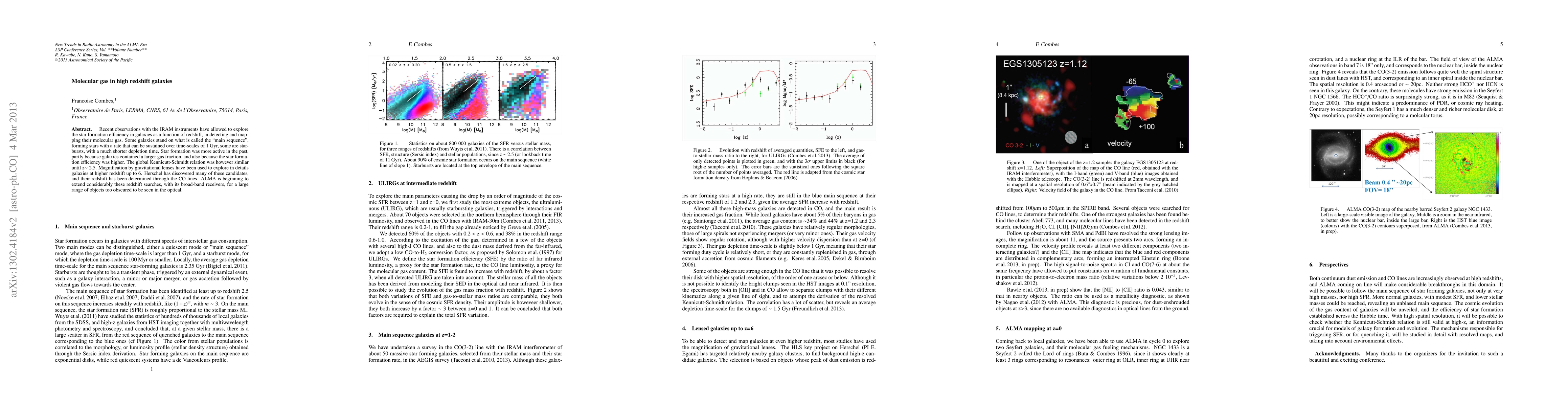 Recent observations with the IRAM instruments have allowed to explore the star formation efficiency in galaxies as a function of redshift, in detecting and mapping their molecular gas. Some galaxies stand on what is called the "main sequence", forming stars with a rate that can be sustained over time-scales of 1 Gyr, some are starbursts, with a much shorter depletion time. Star formation was more active in the past, partly because galaxies contained a larger gas fraction, and also because the star formation efficiency was higher. The global Kennicutt-Schmidt relation was however similar until z \sim 2.5. Magnification by gravitational lenses have been used to explore in details galaxies at higher redshift up to 6. Herschel has discovered many of these candidates, and their redshift has been determined through the CO lines. ALMA is beginning to extend considerably these redshift searches, with its broad-band receivers, for a large range of objects too obscured to be seen in the optical.