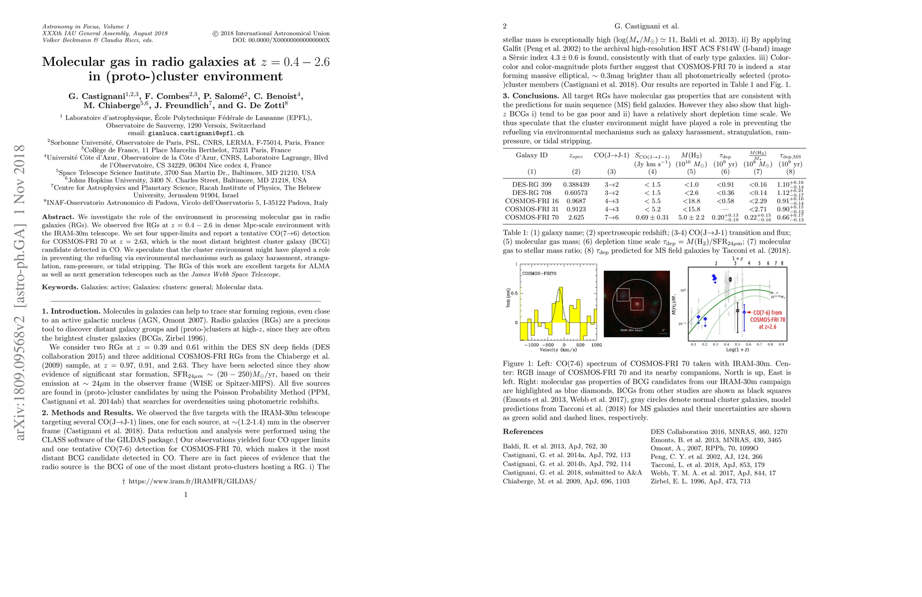 We investigate the role of the environment in processing molecular gas in radio galaxies (RGs). We observed five RGs at $z=0.4-2.6$ in dense Mpc-scale environment with the IRAM-30m telescope. We set four upper-limits and report a tentative CO(7$\rightarrow$6) detection for COSMOS-FRI 70 at $z=2.63$, which is the most distant brightest cluster galaxy (BCG) candidate detected in CO. We speculate that the cluster environment might have played a role in preventing the refueling via environmental mechanisms such as galaxy harassment, strangulation, ram-pressure, or tidal stripping. The RGs of this work are excellent targets for ALMA as well as next generation telescopes such as the James Webb Space Telescope.