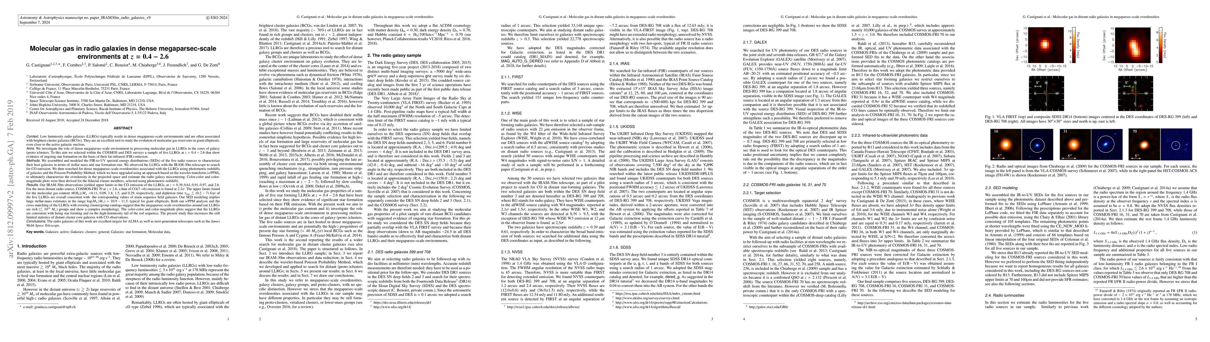 We investigate the role of dense Mpc-scale environment in processing molecular gas in distant Low luminosity radio galaxies (LLRGs) in galaxy (proto-)clusters. We have selected within the COSMOS and DES surveys a sample of five LLRGs at $z=0.4-2.6$ that show evidence of ongoing star formation on the basis of their far-infrared emission. We have assembled and modeled the far-infrared-to-ultraviolet spectral energy distributions (SEDs) of the LLRGs. We have observed the sources with the IRAM-30m telescope to search for CO emission. We have then searched for dense Mpc-scale overdensities associated with the LLRGs using photometric redshifts of galaxies and the Poisson Probability Method, that we have upgraded using the wavelet-transform ($\mathit{w}$PPM), to characterize the overdensity in the projected space. Color-color and color-magnitude plots have been derived for the fiducial cluster members. We set upper limits to the CO emission of the LLRGs, at $z=0.39, 0.61, 0.91, 0.97$, and $2.6$. For the most distant radio source, COSMOS-FRI 70 at $z=2.6$, a hint of CO(7$\rightarrow$6) emission is found at 2.2$\sigma$. The upper limits found for the molecular gas content $M({\rm H}_2)/M_\star<0.11$, 0.09, 1.8, 1.5, and 0.29, respectively, and depletion time $\tau_{\rm dep}\lesssim(0.2-7)$ Gyr of the five LLRGs are overall consistent with the values of main sequence field galaxies. Our SED modeling implies large stellar masses for the LLRGs, in the range $\log(M_\star/M_\odot)=10.9-11.5$, while the associated Mpc-scale overdensities show a complex morphology. The color-color and color-magnitude plots suggest that the LLRGs are consistent with being star forming and on the high-luminosity tail of the red sequence. The present study increases the limited statistics of distant cluster core galaxies with CO observations. The radio galaxies of this work are excellent targets for ALMA and JWST.
