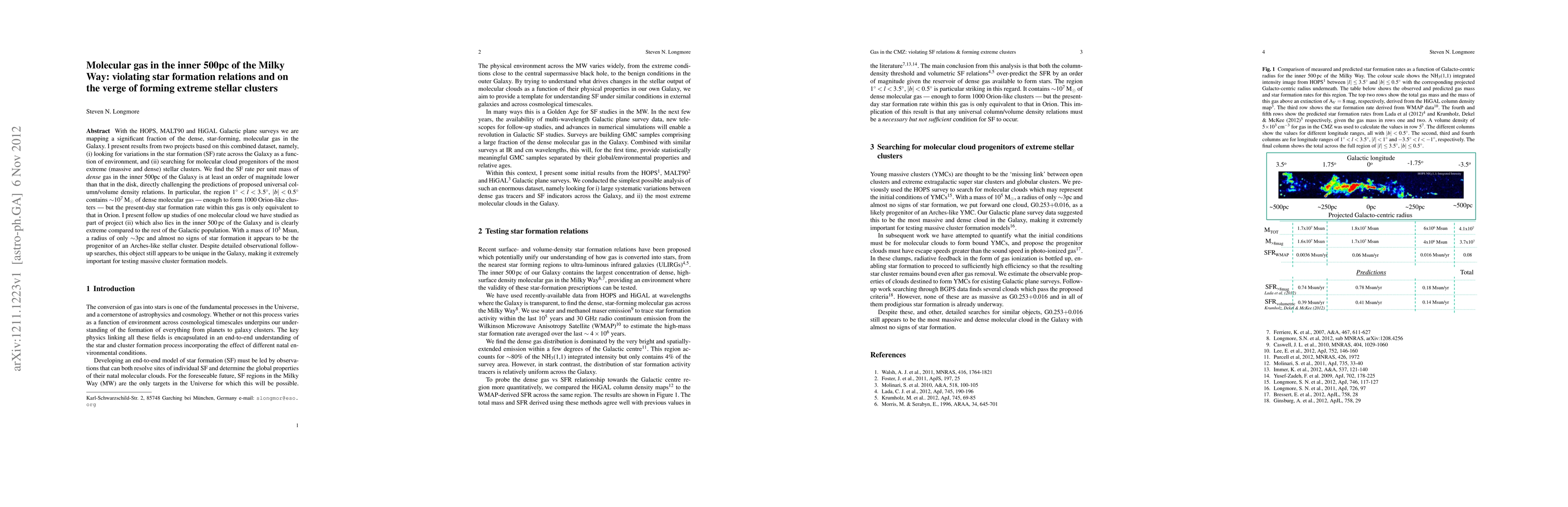 With the HOPS, MALT90 and HiGAL Galactic plane surveys we are mapping a significant fraction of the dense, star-forming, molecular gas in the Galaxy. I present results from two projects based on this combined dataset, namely, (i) looking for variations in the star formation (SF) rate across the Galaxy as a function of environment, and (ii) searching for molecular cloud progenitors of the most extreme (massive and dense) stellar clusters. We find the SF rate per unit mass of dense gas in the inner 500pc of the Galaxy is at least an order of magnitude lower than that in the disk, directly challenging the predictions of proposed universal column/volume density relations. In particular, the region 1 degrees < l < 3.5 degrees, |b| < 0.5 degrees contains ~1E7 Msun of dense molecular gas -- enough to form 1000 Orion-like clusters -- but the present-day star formation rate within this gas is only equivalent to that in Orion. I present follow up studies of one molecular cloud we have studied as part of project (ii) which also lies in the inner 500 pc of the Galaxy and is clearly extreme compared to the rest of the Galactic population. With a mass of 1E5 Msun,a radius of only ~3pc and almost no signs of star formation it appears to be the progenitor of an Arches-like stellar cluster. Despite detailed observational followup searches, this object still appears to be unique in the Galaxy, making it extremely important for testing massive cluster formation models.