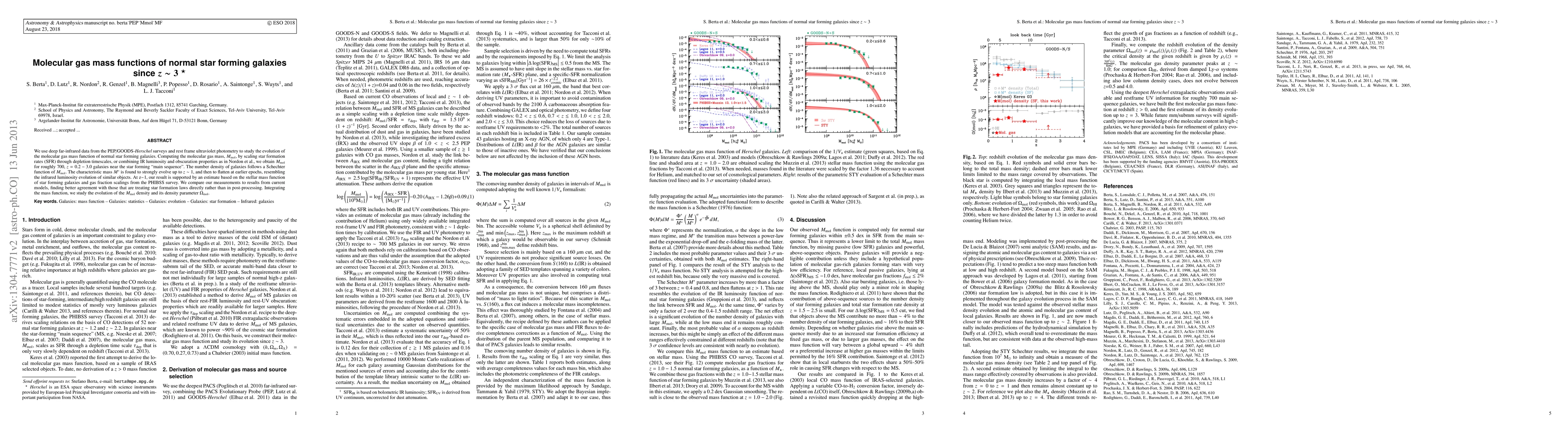 We use deep far-infrared data from the PEP/GOODS-Herschel surveys and rest frame ultraviolet photometry to study the evolution of the molecular gas mass function of normal star forming galaxies. Computing the molecular gas mass, M(mol), by scaling star formation rates (SFR) through depletion timescales, or combining IR luminosity and obscuration properties as in Nordon et al., we obtain M(mol) for roughly 700, z=0.2-3.0 galaxies near the star forming "main sequence". The number density of galaxies follows a Schechter function of M(mol). The characteristic mass M* is found to strongly evolve up to z~1, and then to flatten at earlier epochs, resembling the infrared luminosity evolution of similar objects. At z~1, our result is supported by an estimate based on the stellar mass function of star forming galaxies and gas fraction scalings from the PHIBSS survey. We compare our measurements to results from current models, finding better agreement with those that are treating star formation laws directly rather than in post-processing. Integrating the mass function, we study the evolution of the M(mol) density and its density parameter Omega(mol).