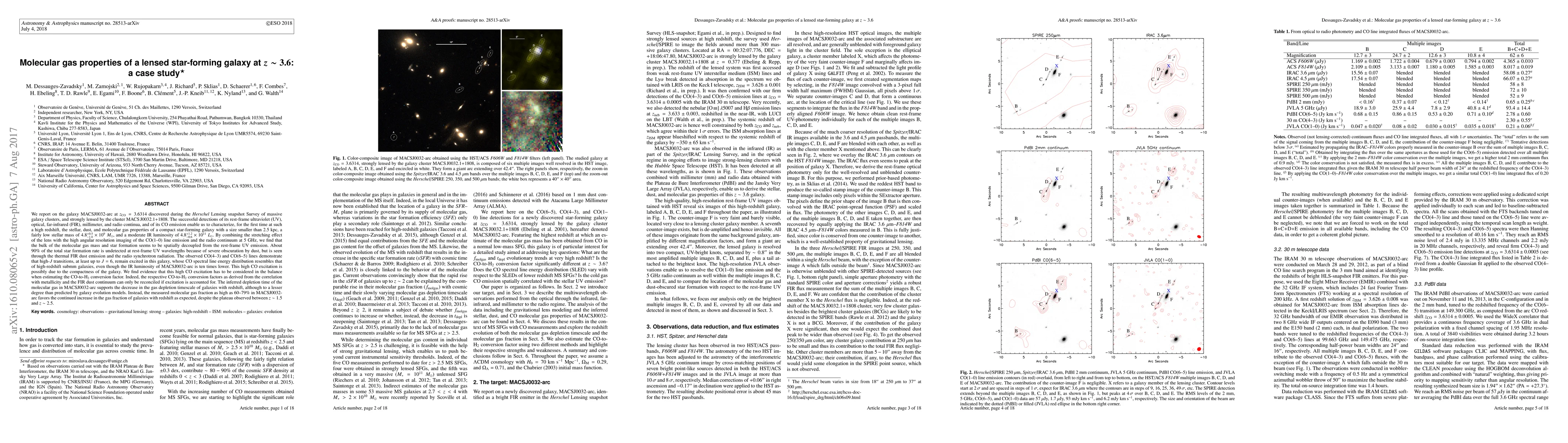 This study characterizes the molecular gas properties of the lensed star-forming galaxy MACSJ0032-arc at z=3.6314, revealing high CO excitation and a molecular gas fraction of 60-79%. The star formation is largely obscured by dust, detectable only via FIR and radio emissions.