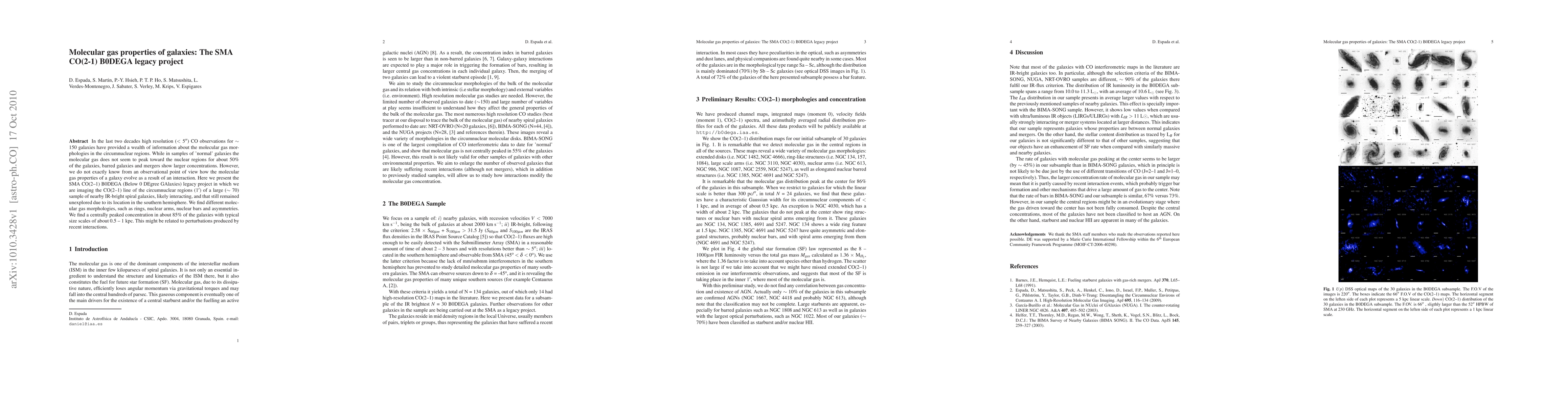 In the last two decades high resolution (< 5 arcsec) CO observations for ~ 150 galaxies have provided a wealth of information about the molecular gas morphologies in the circumnuclear regions. While in samples of 'normal' galaxies the molecular gas does not seem to peak toward the nuclear regions for about 50% of the galaxies, barred galaxies and mergers show larger concentrations. However, we do not exactly know from an observational point of view how the molecular gas properties of a galaxy evolve as a result of an interaction. Here we present the SMA CO(2-1) B0DEGA (Below 0 DEgree GAlaxies) legacy project in which we are imaging the CO(2-1) line of the circumnuclear regions (1 arcmin) of a large (~ 70) sample of nearby IR-bright spiral galaxies, likely interacting, and that still remained unexplored due to its location in the southern hemisphere. We find different molecular gas morphologies, such as rings, nuclear arms, nuclear bars and asymmetries. We find a centrally peaked concentration in about 85% of the galaxies with typical size scales of about 0.5 - 1 kpc. This might be related to perturbations produced by recent interactions.
