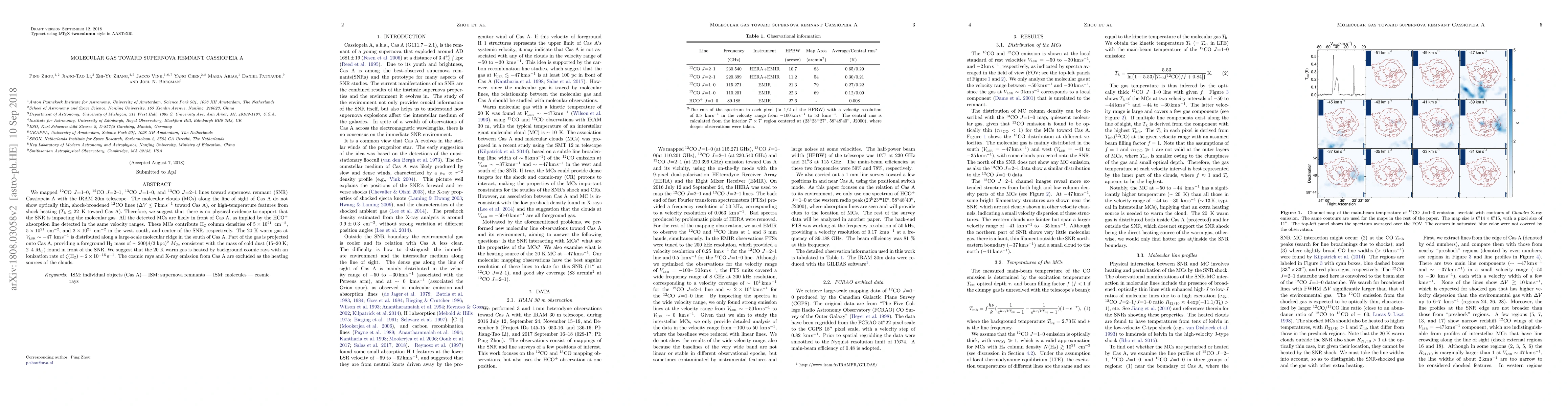 This paper reports on CO line mapping of molecular clouds toward supernova remnant Cassiopeia A, finding no evidence of shock-induced gas heating or interaction with the remnant. The study identifies molecular clouds in front of Cas A, contributing to foreground H$_2$ mass, and suggests cosmic rays as the heating source for the 20 K warm gas.