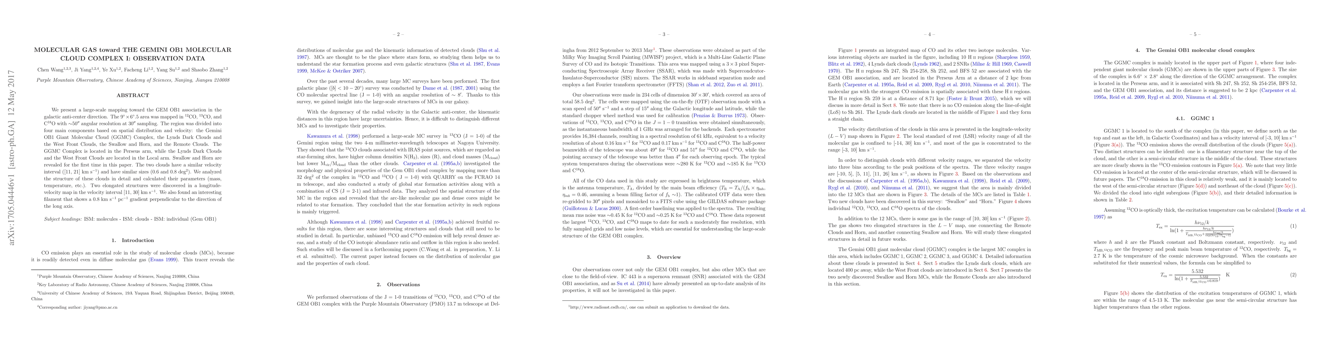 We present a large-scale mapping toward the GEM OB1 association in the galactic anti-center direction. The 9^deg * 6.5^deg area was mapped in 12CO, 13CO, and C18O with 50" angular resolution at 30" sampling. The region was divided into four main components based on spatial distribution and velocity: the Gemini OB1 Giant Molecular Cloud (GGMC) Complex, the Lynds Dark Clouds and the West Front Clouds, the Swallow and Horn, and the Remote Clouds. The GGMC Complex is located in the Perseus arm, while the Lynds Dark Clouds and the West Front Clouds are located in the Local arm. Swallow and Horn are revealed for the first time in this paper. The two clouds have a similar velocity interval ([11, 21] km s^-1) and have similar sizes (0.6 and 0.8 deg^2). We analyzed the structure of these clouds in detail and calculated their parameters (mass, temperature, etc.). Two elongated structures were discovered in a longitude-velocity map in the velocity interval [11, 30] km s^-1. We also found an interesting filament that shows a 0.8 km s^-1 pc^-1 gradient perpendicular to the direction of the long axis.