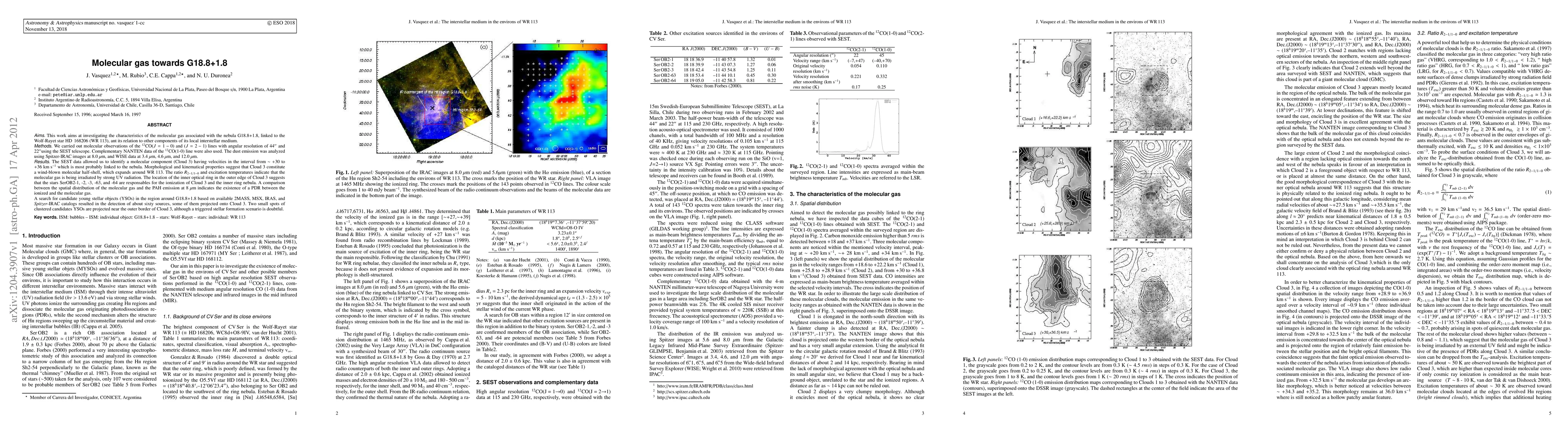This work aims at investigating the characteristics of the molecular gas associated with the nebula G18.8+1.8, linked to the Wolf-Rayet star HD168206 (WR 113), and its relation to other components of its local interstellar medium. We carried out molecular observations of the 12CO(J=1-0) and (J=2-1) lines with angular resolution of 44 arcsec and 22 arcsec using the SEST telescope. Complementary NANTEN data of the 12CO(1-0) line were also used. The dust emission was analyzed using Spitzer-IRAC images at 8.0 microns, and WISE data at 3.4, 4.6, and 12.0 microns. The SEST data allowed us to identify a molecular component (Cloud 3) having velocities in the interval from ~ +30 to +36 km/s which is most probably linked to the nebula. Morphological and kinematical properties suggest that Cloud 3 constitute a wind-blown molecular half-shell, which expands around WR113. The ratio R_(2-1/1-0) and excitation temperatures indicate that the molecular gas is being irradiated by strong UV radiation. The location of the inner optical ring in the outer edge of Cloud 3 suggests that the stars SerOB2-1, -2, -3, -63, and -64 are responsables for the ionization of Cloud 3 and the inner ring nebula. A comparison between the spatial distribution of the molecular gas and the PAH emission at 8 $\mu$m indicates the existence of a PDR between the ionized and the molecular gas. A search for candidate young stellar objects (YSOs) in the region around G18.8+1.8 based on available 2MASS, MSX, IRAS, and Spitzer-IRAC catalogs resulted in the detection of about sixty sources, some of them projected onto Cloud 3. Two small spots of clustered candidates YSOs are projected near the outer border of Cloud 3, although a triggered stellar formation scenario is doubtful.