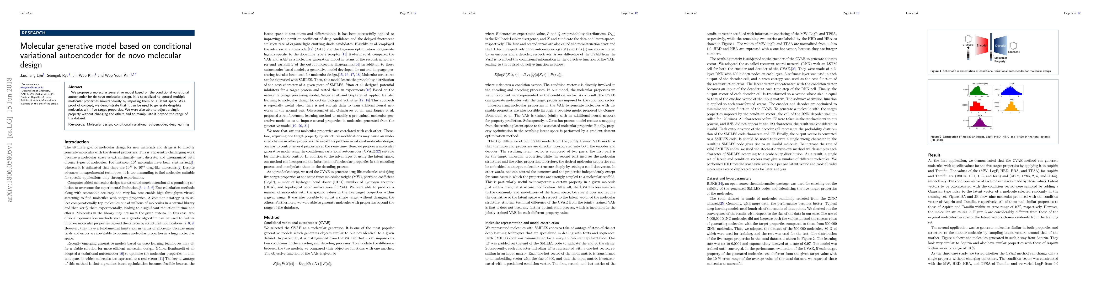 This paper introduces a conditional variational autoencoder for de novo molecular design, enabling the simultaneous control of multiple molecular properties. It successfully generates drug-like molecules with specified properties and demonstrates the ability to adjust a single property independently.