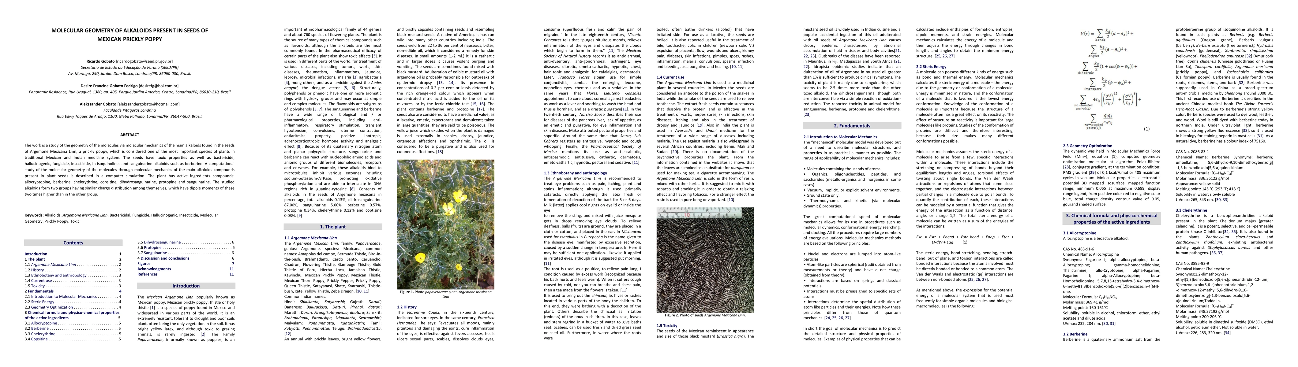 This study investigates the molecular geometry of key alkaloids in Argemone Mexicana seeds using molecular mechanics, revealing two groups with distinct charge distributions and significantly higher dipole moments. The alkaloids include allocryptopine, berberine, chelerythrine, copsitine, dihydrosanguinarine, protopine, and sanguinarine.