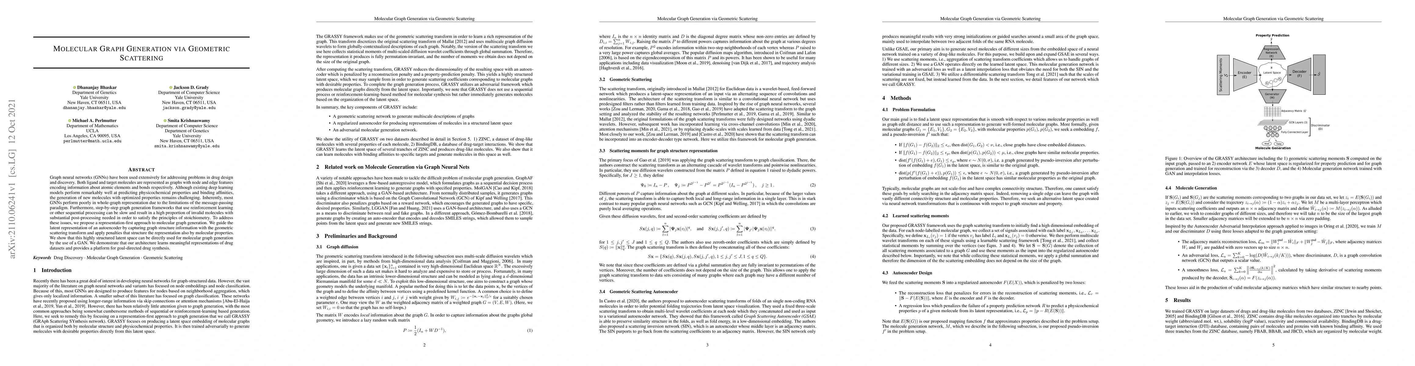 This paper proposes a new method for generating molecular graphs using a representation-first approach guided by geometric scattering transforms and autoencoders, enabling efficient and structured generation of new molecules with optimized properties. The approach leverages a GAN to produce valid molecules directly from the structured latent space, offering a platform for goal-directed drug synthesis.