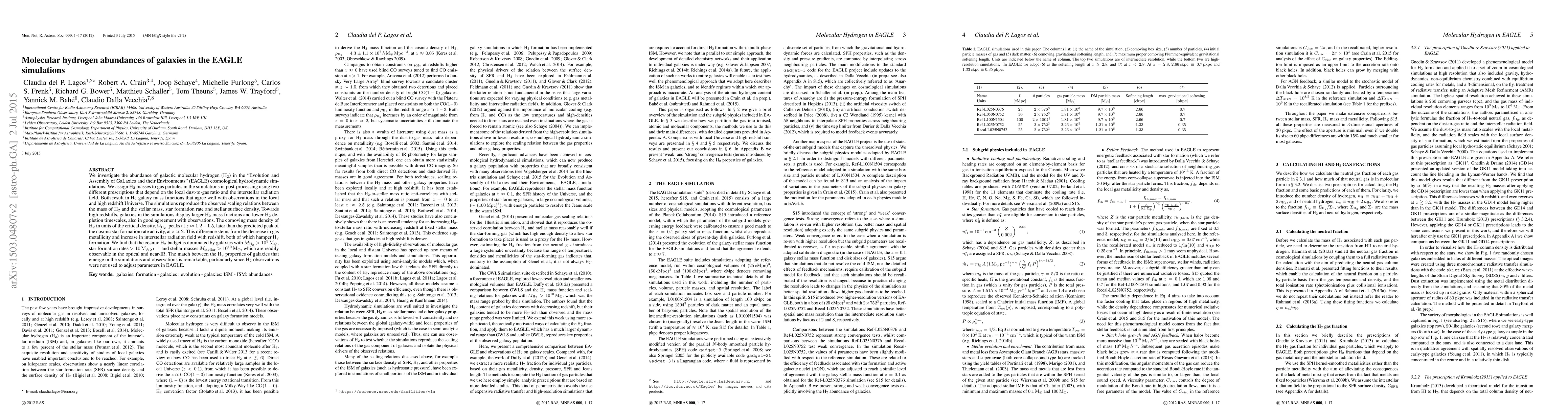 This paper examines molecular hydrogen (H$_2$) abundances in galaxies from the EAGLE simulations, finding good agreement between simulated and observed H$_2$ mass functions and scaling relations. The simulations show that the peak H$_2$ density occurs later than the peak in star formation activity due to changes in gas metallicity and radiation fields with redshift.