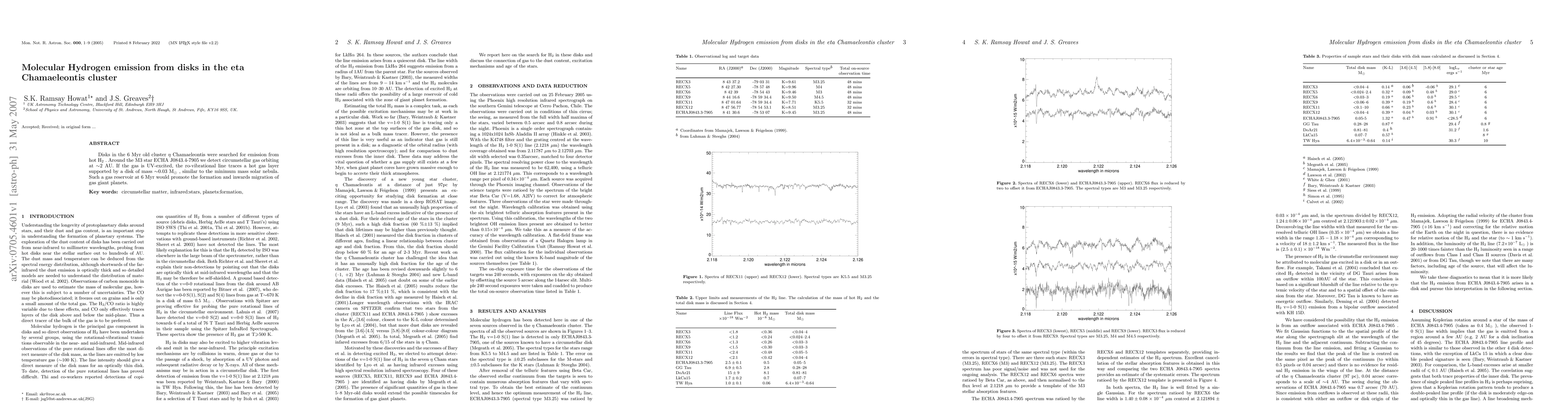 Disks in the 6 Myr old cluster eta Chamaeleontis were searched for emission from hot H2. Around the M3 star ECHAJ0843.3-7905 we detect circumstellar gas orbiting at ~2 AU. If the gas is UV-excited, the ro-vibrational line traces a hot gas layer supported by a disk of mass ~0.03Msolar, similar to the minimum mass solar nebula. Such a gas reservoir at 6 Myr would promote the formation and inwards migration of gas giant planets.