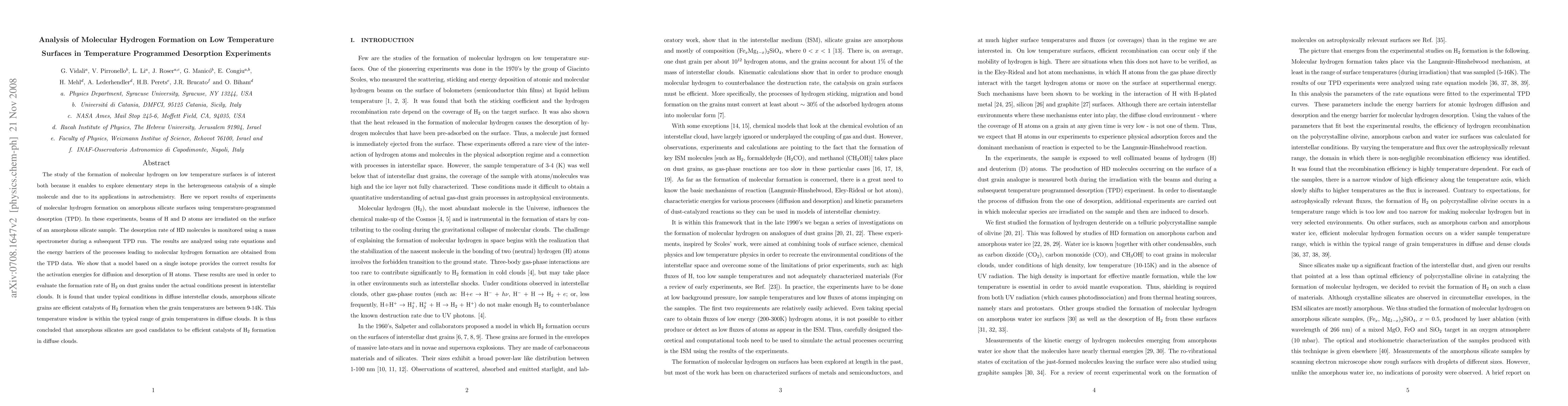 This study investigates molecular hydrogen formation on low temperature amorphous silicate surfaces using temperature-programmed desorption. The experiments reveal activation energies for hydrogen diffusion and desorption, providing insights into H_2 formation relevant to interstellar chemistry.