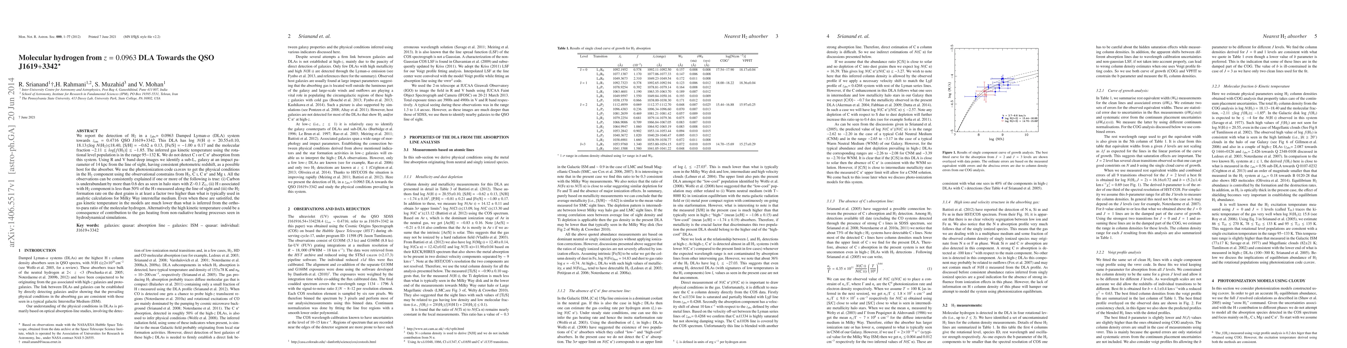 The paper reports the detection of molecular hydrogen (H2) in a Damped Lyman-alpha (DLA) system at z=0.0963 towards QSO J1619+3342. Using observations and CLOUDY simulations, the researchers explore conditions in the H2 component, suggesting underabundant carbon, low H I association, or enhanced H2 formation rates on dust grains to explain their findings. Despite these, inferred gas kinetic temperature remains higher than model predictions, hinting at non-radiative heating processes.