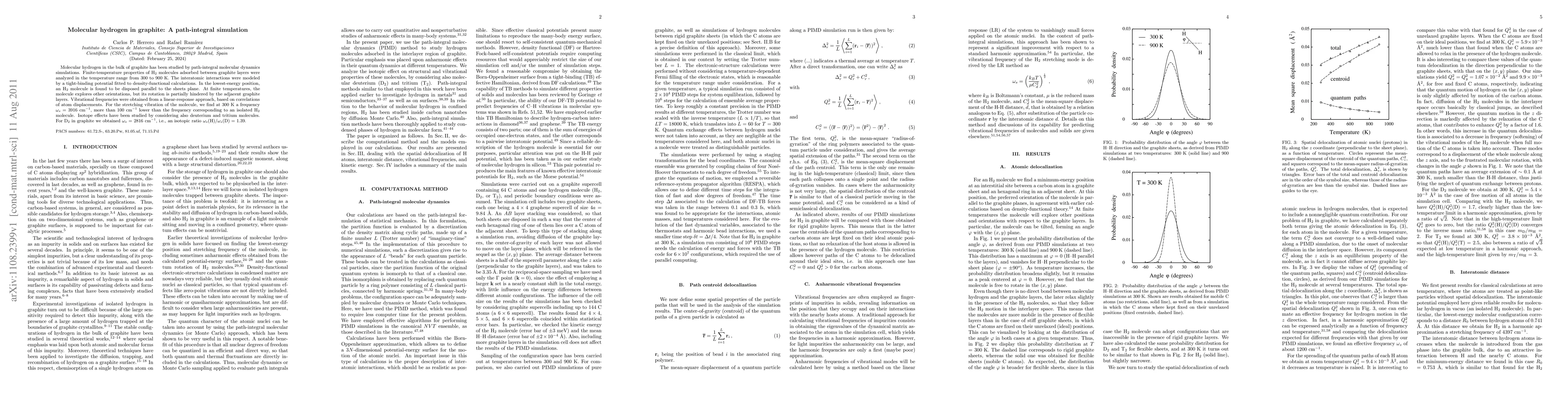 Molecular hydrogen in the bulk of graphite has been studied by path-integral molecular dynamics simulations. Finite-temperature properties of H_2 molecules adsorbed between graphite layers were analyzed in the temperature range from 300 to 900 K. The interatomic interactions were modeled by a tight-binding potential fitted to density-functional calculations. In the lowest-energy position, an H_2 molecule is found to be disposed parallel to the sheets plane. At finite temperatures, the molecule explores other orientations, but its rotation is partially hindered by the adjacent graphite layers. Vibrational frequencies were obtained from a linear-response approach, based on correlations of atom displacements. For the stretching vibration of the molecule, we find at 300 K a frequency omega_s = 3916 cm-1, more than 100 cm-1 lower than the frequency corresponding to an isolated H_2 molecule. Isotope effects have been studied by considering also deuterium and tritium molecules. For D_2 in graphite we obtained omega_s = 2816 cm-1}, i.e., an isotopic ratio omega_s(H) / omega_s(D) = 1.39.