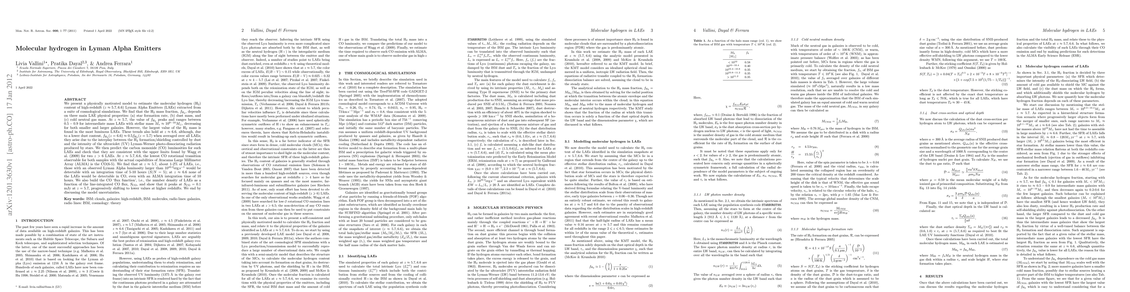 This paper models the molecular hydrogen (H2) content in high-redshift Lyman Alpha Emitters (LAEs) using cosmological simulations, finding that H2 mass fraction peaks at z~5.7 for intermediate mass LAEs. The study predicts CO luminosities consistent with observational limits and suggests that only a small fraction of LAEs at z~5.7 may be detectable in CO with current technology.