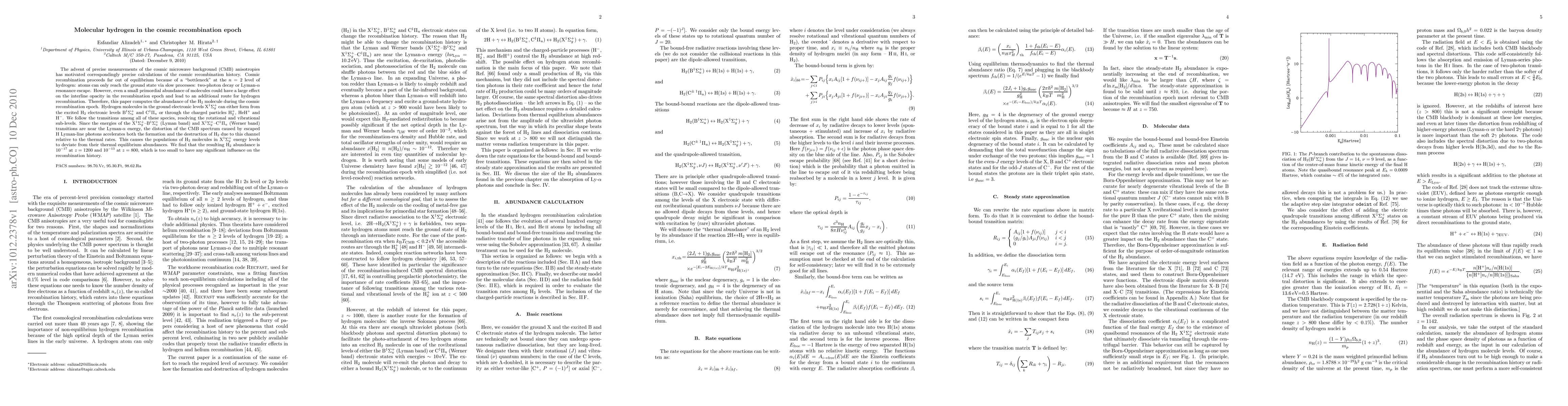 This paper investigates the formation of H$_2$ molecules during the cosmic recombination epoch, finding that their abundance is $10^{-17}$ at $z=1200$ and $10^{-13}$ at $z=800$. Despite the potential impact on interline opacity, these low abundances imply negligible influence on the recombination history.