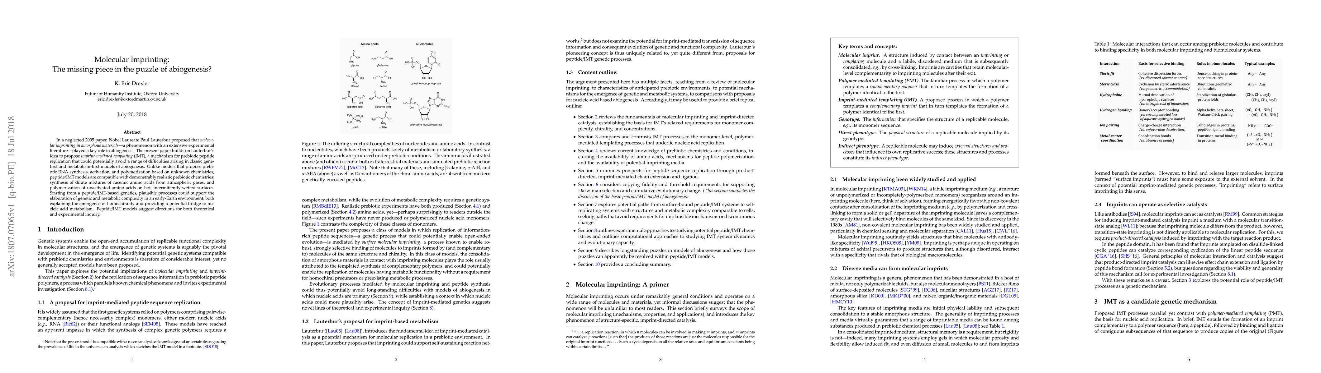 In a neglected 2005 paper, Nobel Laureate Paul Lauterbur proposed that molecular imprinting in amorphous materials -- a phenomenon with an extensive experimental literature -- played a key role in abiogenesis. The present paper builds on Lauterbur's idea to propose imprint-mediated templating (IMT), a mechanism for prebiotic peptide replication that could potentially avoid a range of difficulties arising in classic gene-first and metabolism-first models of abiogenesis. Unlike models that propose prebiotic RNA synthesis, activation, and polymerization based on unknown chemistries, peptide/IMT models are compatible with demonstrably realistic prebiotic chemistries: synthesis of dilute mixtures of racemic amino acids from atmospheric gases, and polymerization of unactivated amino acids on hot, intermittently-wetted surfaces. Starting from a peptide/IMT-based genetics, plausible processes could support the elaboration of genetic and metabolic complexity in an early-Earth environment, both explaining the emergence of homochirality and providing a potential bridge to nucleic acid metabolism. Peptide/IMT models suggest directions for both theoretical and experimental inquiry.