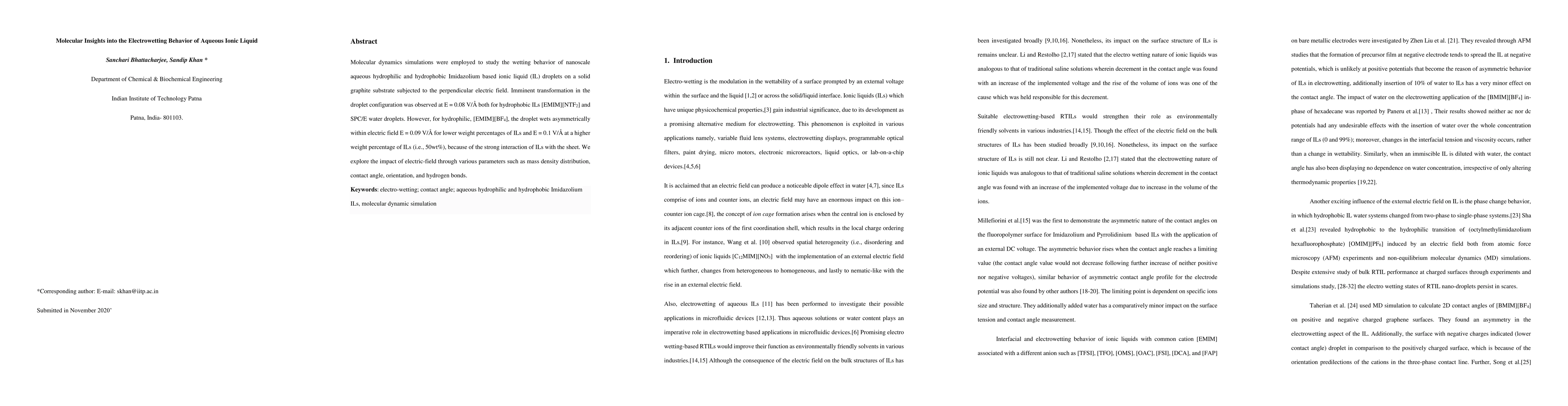 This paper uses molecular dynamics simulations to explore the electrowetting behavior of nanoscale aqueous hydrophilic and hydrophobic Imidazolium-based ionic liquid droplets on graphite under electric fields, highlighting differences in droplet wetting behavior at varying electric field strengths and ionic liquid concentrations.
