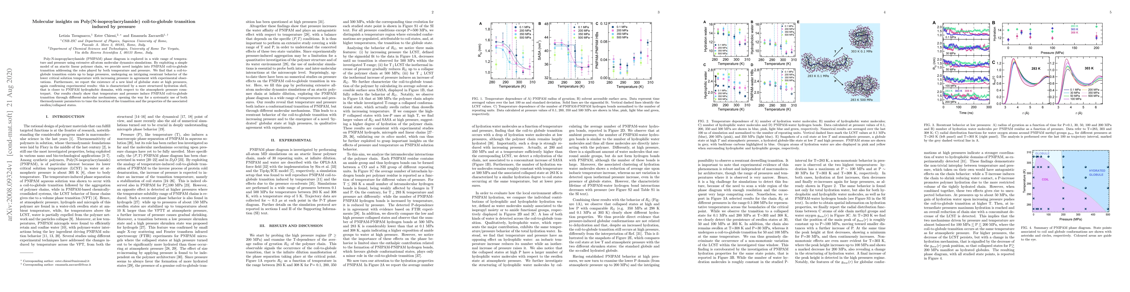 Poly-N-isopropylacrylamide (PNIPAM) phase diagram is explored in a wide range of temperature and pressure using extensive all-atom molecular dynamics simulations. By exploiting a simple model of an atactic linear polymer chain, we provide novel insights into PNIPAM coil-to-globule transition addressing the roles played by both temperature and pressure. We find that a coil-to-globule transition exists up to large pressures, undergoing an intriguing reentrant behavior of the lower critical solution temperature with increasing pressure in agreement with experimental observations. Furthermore, we report the existence of a new kind of globular state at high pressures, again confirming experimental results: this is characterized by a more structured hydration shell, that is closer to PNIPAM hydrophobic domains, with respect to the atmospheric pressure counterpart. Our results clearly show that temperature and pressure induce PNIPAM coil-to-globule transition through different molecular mechanisms, opening the way for a systematic use of both thermodynamic parameters to tune the location of the transition and the properties of the associated swollen/collapsed states.