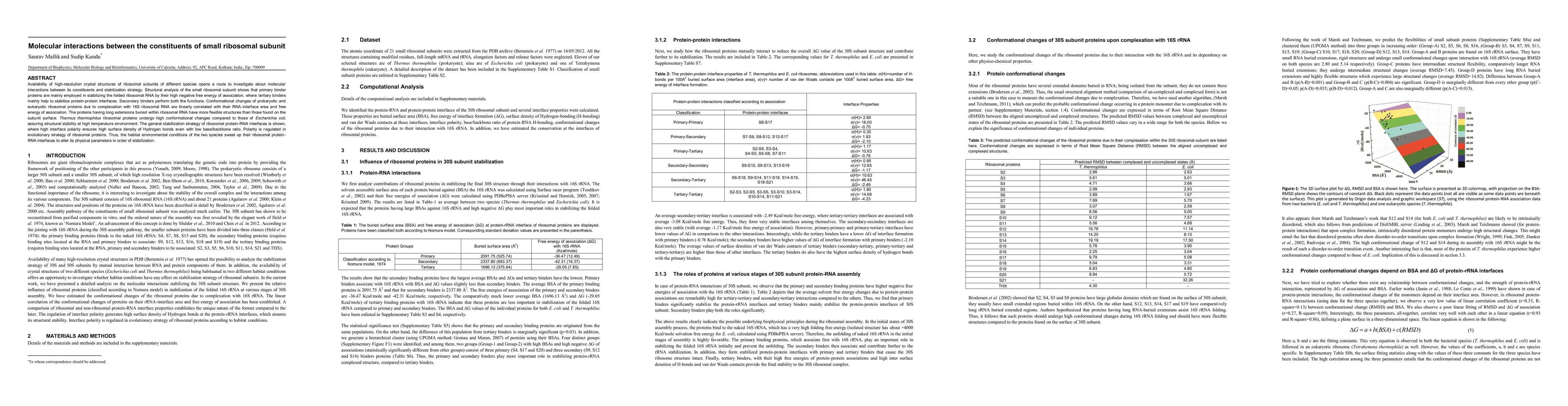 This paper investigates molecular interactions in the small ribosomal subunit, revealing that primary binders stabilize folded ribosomal RNA, while tertiary binders enhance protein-protein interfaces. The study shows that ribosomal proteins undergo conformational changes correlating with their RNA-interface area, with Thermus thermophilus adapting more than Escherichia coli for optimal stability in high-temperature environments.