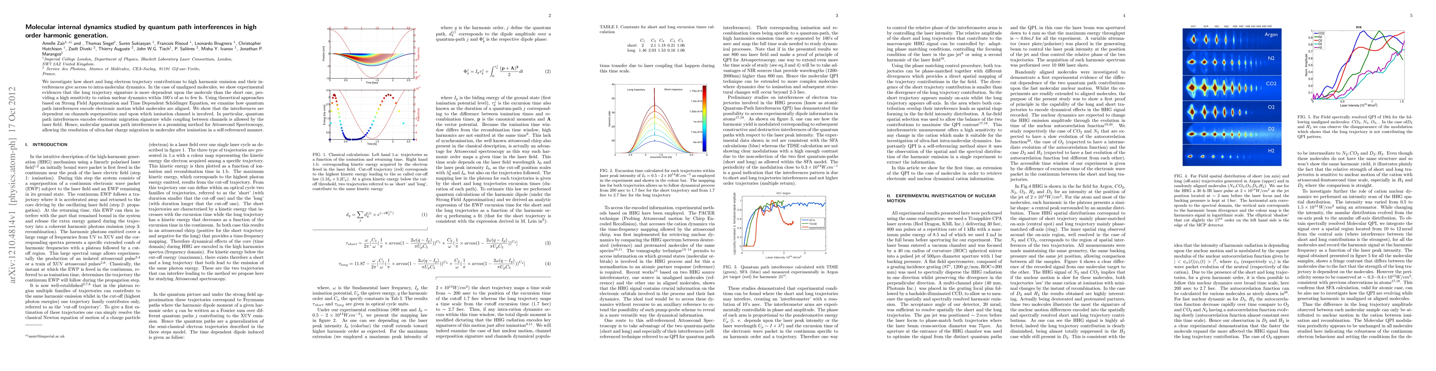 We investigate how short and long electron trajectory contributions to high harmonic emission and their interferences give access to intra-molecular dynamics. In the case of unaligned molecules, we show experimental evidences that the long trajectory signature is more dependent upon the molecule than the short one, providing a high sensitivity to cation nuclear dynamics within 100's of as to few fs. Using theoretical approaches based on Strong Field Approximation and Time Dependent Schrodinger Equation, we examine how quantum path interferences encode electronic motion whilst molecules are aligned. We show that the interferences are dependent on channels superposition and upon which ionisation channel is involved. In particular, quantum path interferences encodes electronic migration signature while coupling between channels is allowed by the laser field. Hence, molecular quantum path interferences is a promising method for Attosecond Spectroscopy, allowing the resolution of ultra-fast charge migration in molecules after ionisation in a self-referenced manner.