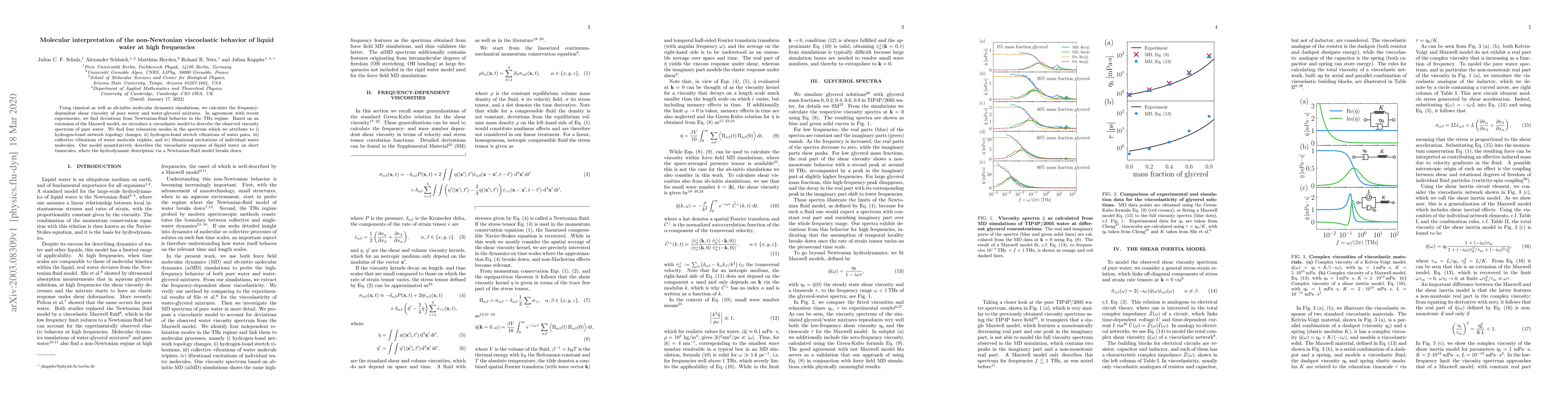 Using classical as well as ab-initio molecular dynamics simulations, we calculate the frequency-dependent shear viscosity of pure water and water-glycerol mixtures. In agreement with recent experiments, we find deviations from Newtonian-fluid behavior in the THz regime. Based on an extension of the Maxwell model, we introduce a viscoelastic model to describe the observed viscosity spectrum of pure water. We find four relaxation modes in the spectrum which we attribute to i) hydrogen-bond network topology changes, ii) hydrogen-bond stretch vibrations of water pairs, iii) collective vibrations of water molecule triplets, and iv) librational excitations of individual water molecules. Our model quantitatively describes the viscoelastic response of liquid water on short timescales, where the hydrodynamic description via a Newtonian-fluid model breaks down.