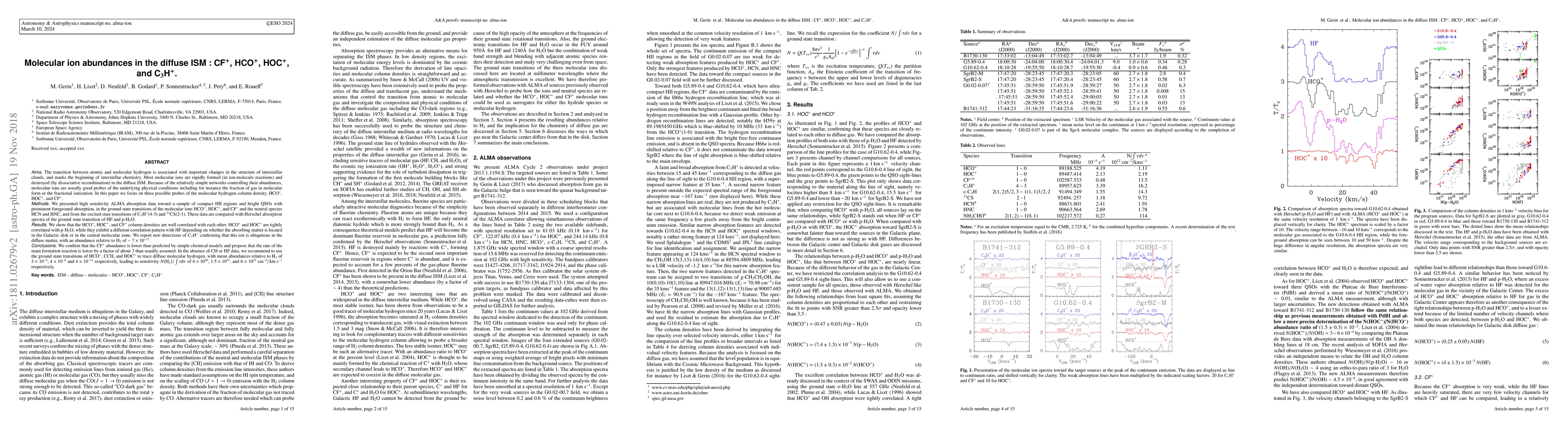This study examines molecular ion abundances in the diffuse interstellar medium, revealing correlations between HCO+, HOC+, CF+ and other neutral species like p-H2O and HF.